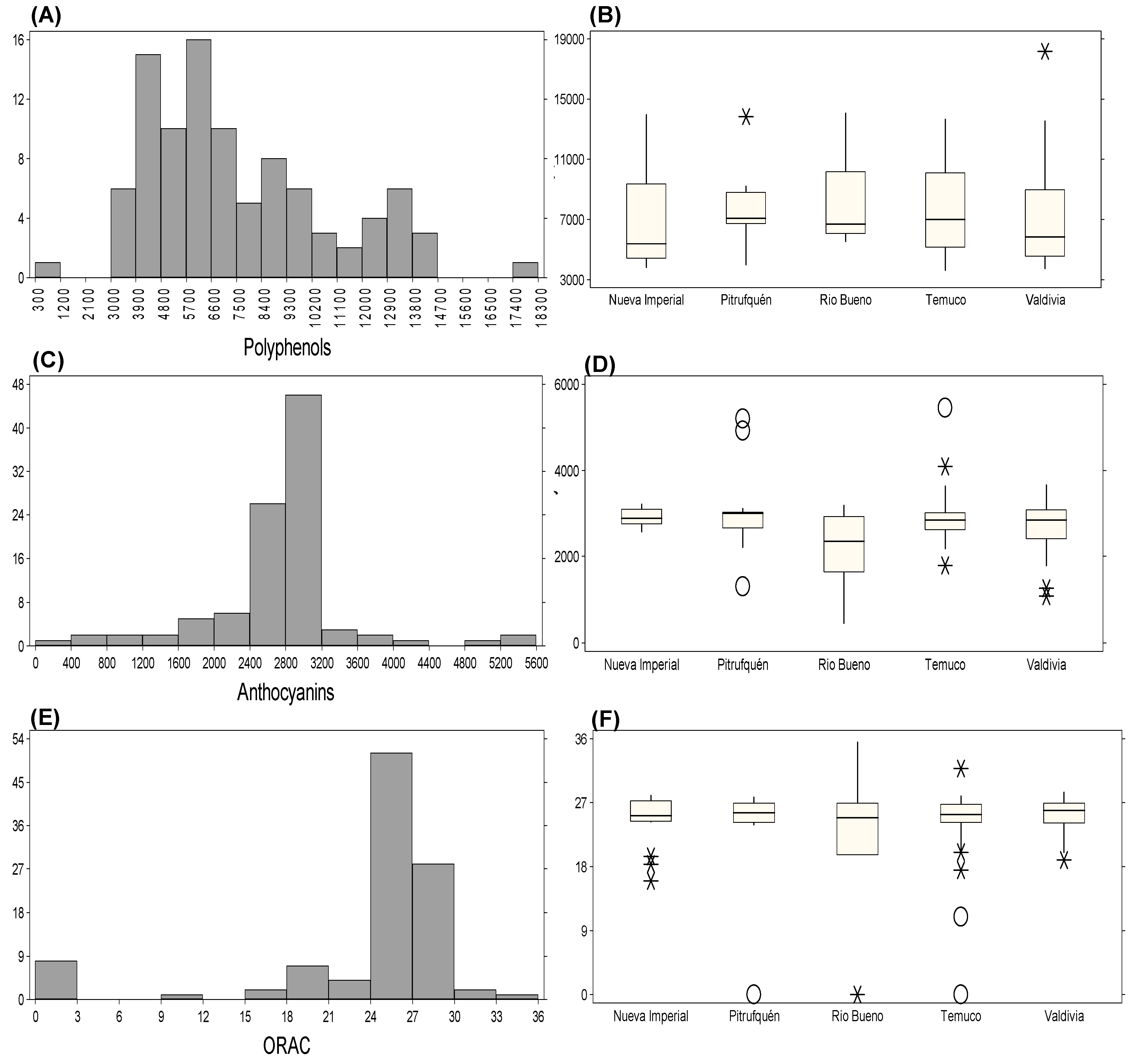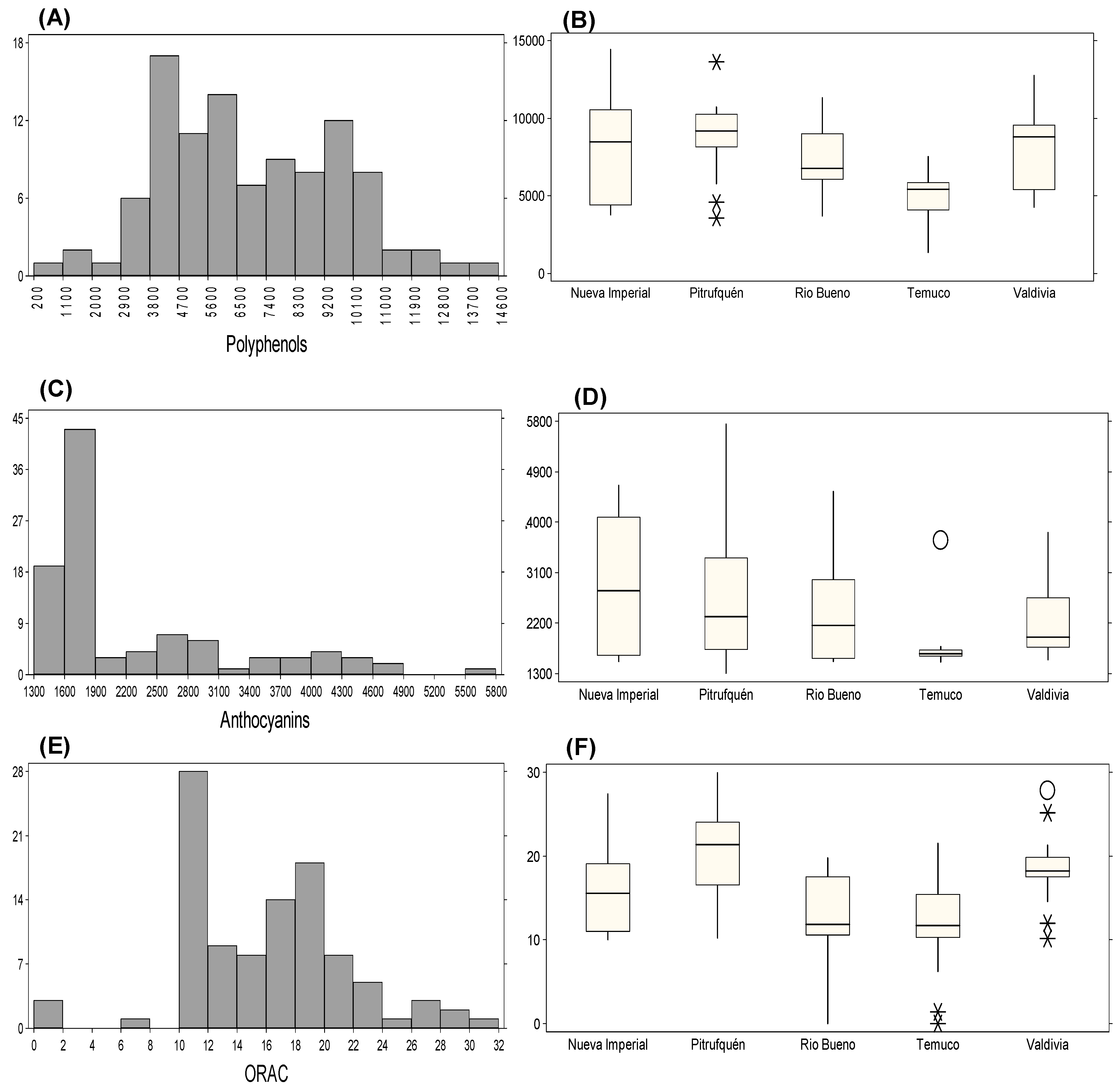 | Total polyphenols (mg GAE/100 g) | 7607.80 | 3237.60 | 42.55 | 3644.80 | 18,169.00 |