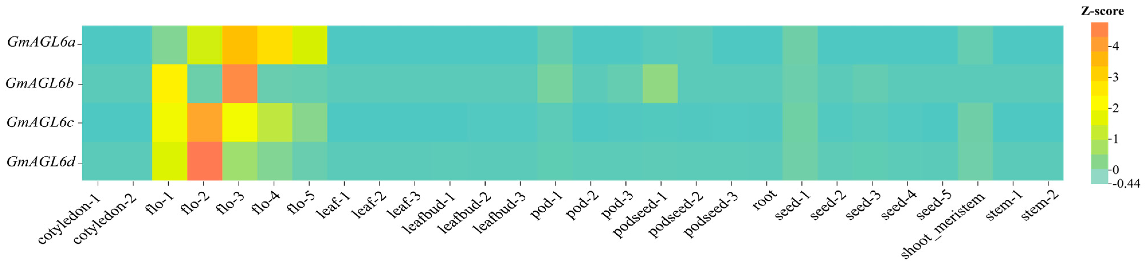 3.1. Evolutionary and Structural Perspectives on GmAGL6 Genes in Soybean