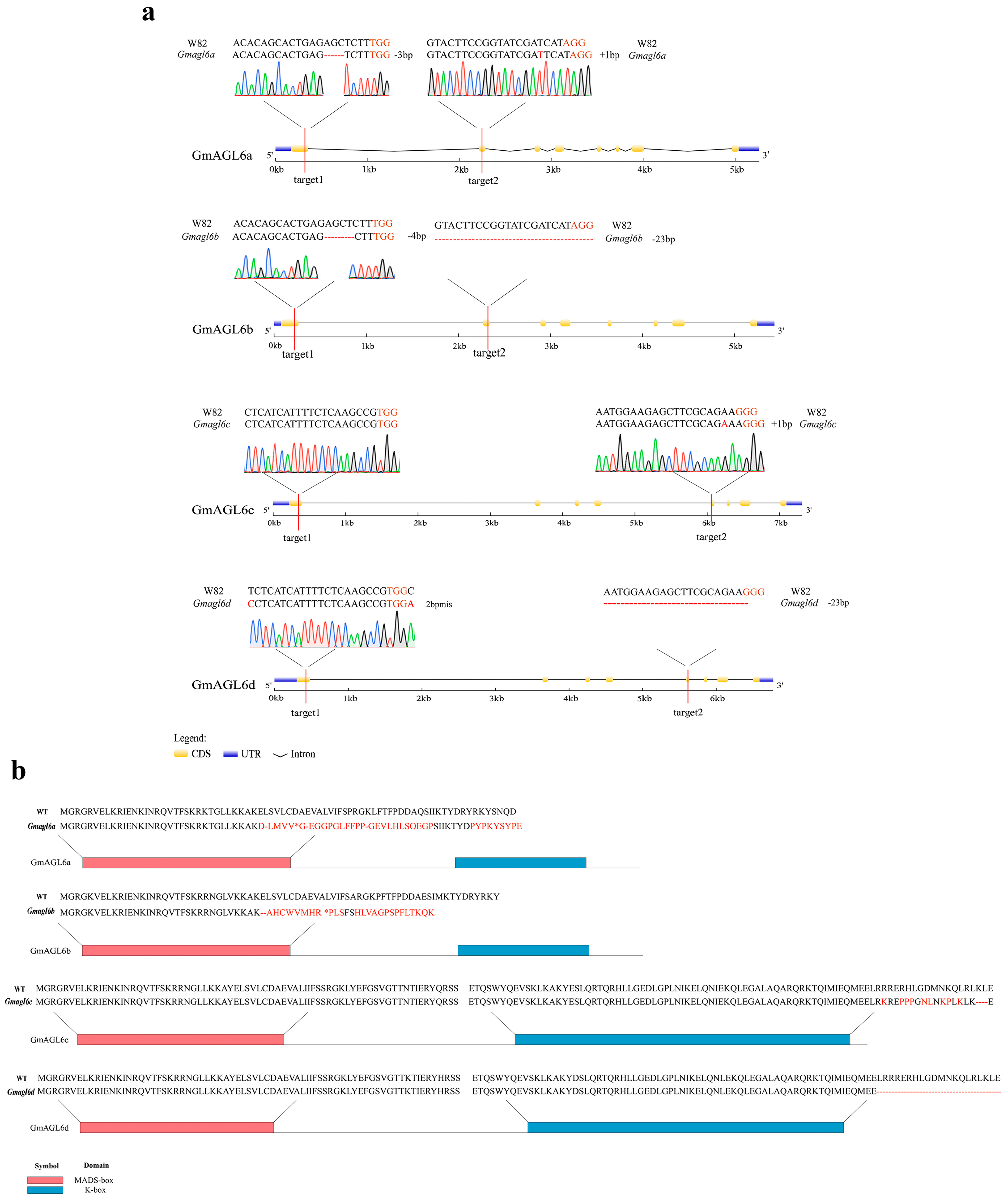 Besides, in our research, the lethal phenotype of the Gmagl6-1 line among the T0 generation of soybean GmAGL6 gene-edited lines provides a novel perspective for understanding the functional thresholds of this gene family. Structurally, the MADS-box domain is primarily responsible for sequence-specific DNA binding, while the K-box mediates essential protein–protein interactions. The inactivation of the MADS-box domains in GmAGL6c and GmAGL6d within the Gmagl6-1 line likely led to a complete disruption of transcriptional regulation for downstream targets vital for seed development; in contrast, the mutations in Gmagl6-3 involved only partial truncations of the K-box, which may have preserved sufficient basal transcriptional activity to support germination, albeit resulting in a reduced seed size phenotype. Since the Gmagl6-1 seeds failed to germinate, we were unable to perform repeated validation in subsequent generations. Consequently, it remains undetermined whether this phenomenon stems from the specific loss of GmAGL6c/d function or represents a “dosage accumulation effect” arising from the quadruple mutations. These preliminary observations highlight a potential role for GmAGL6 in seed germination, and it is necessary to develop more refined allelic series in the future to clarify the precise contribution of the MADS-box domain to this process.