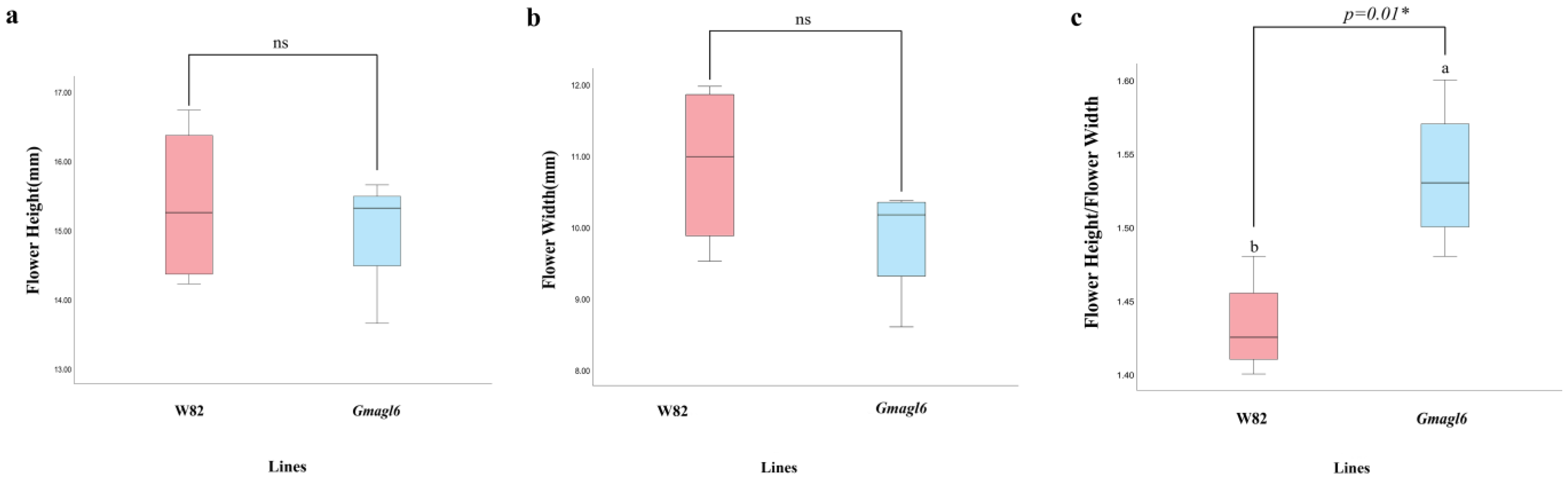 To further quantify floral morphology, we measured flower height, flower width, and the flower height-to-width ratio in wild-type (Williams 82) and
