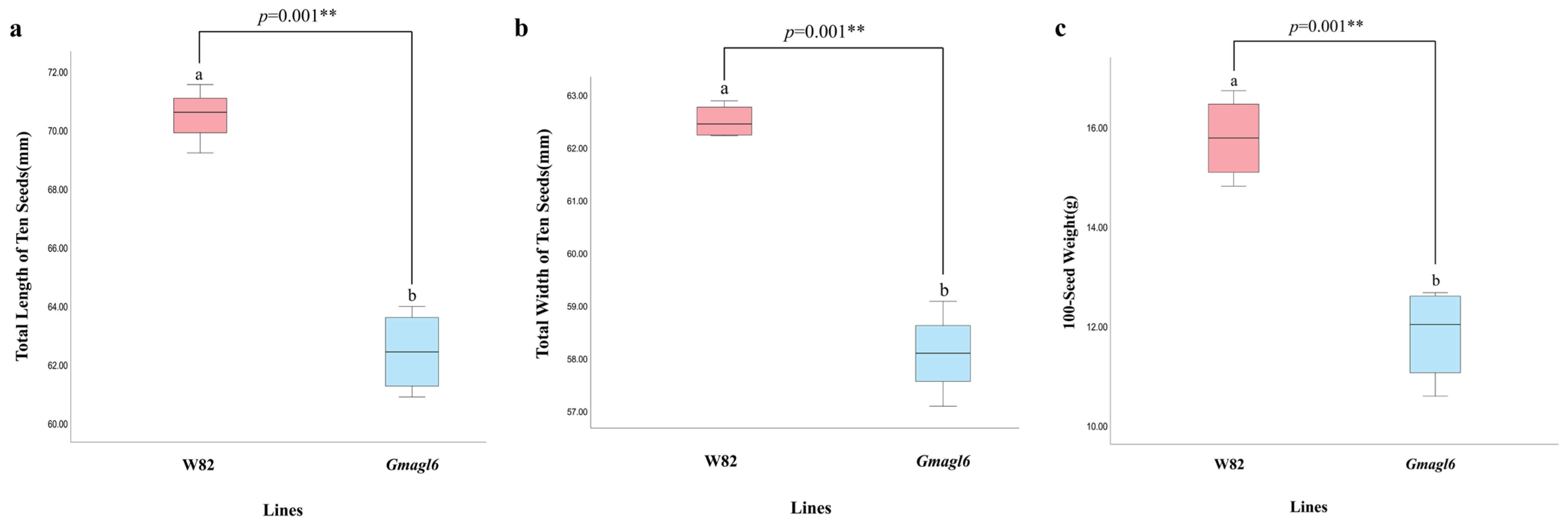 Tables S8–S10). Statistical comparisons revealed that both the total length and total width of ten seeds in the mutant lines were significantly reduced compared to those of the wild-type (Williams 82). Furthermore, a marked decrease in the 100-seed weight was observed in the
