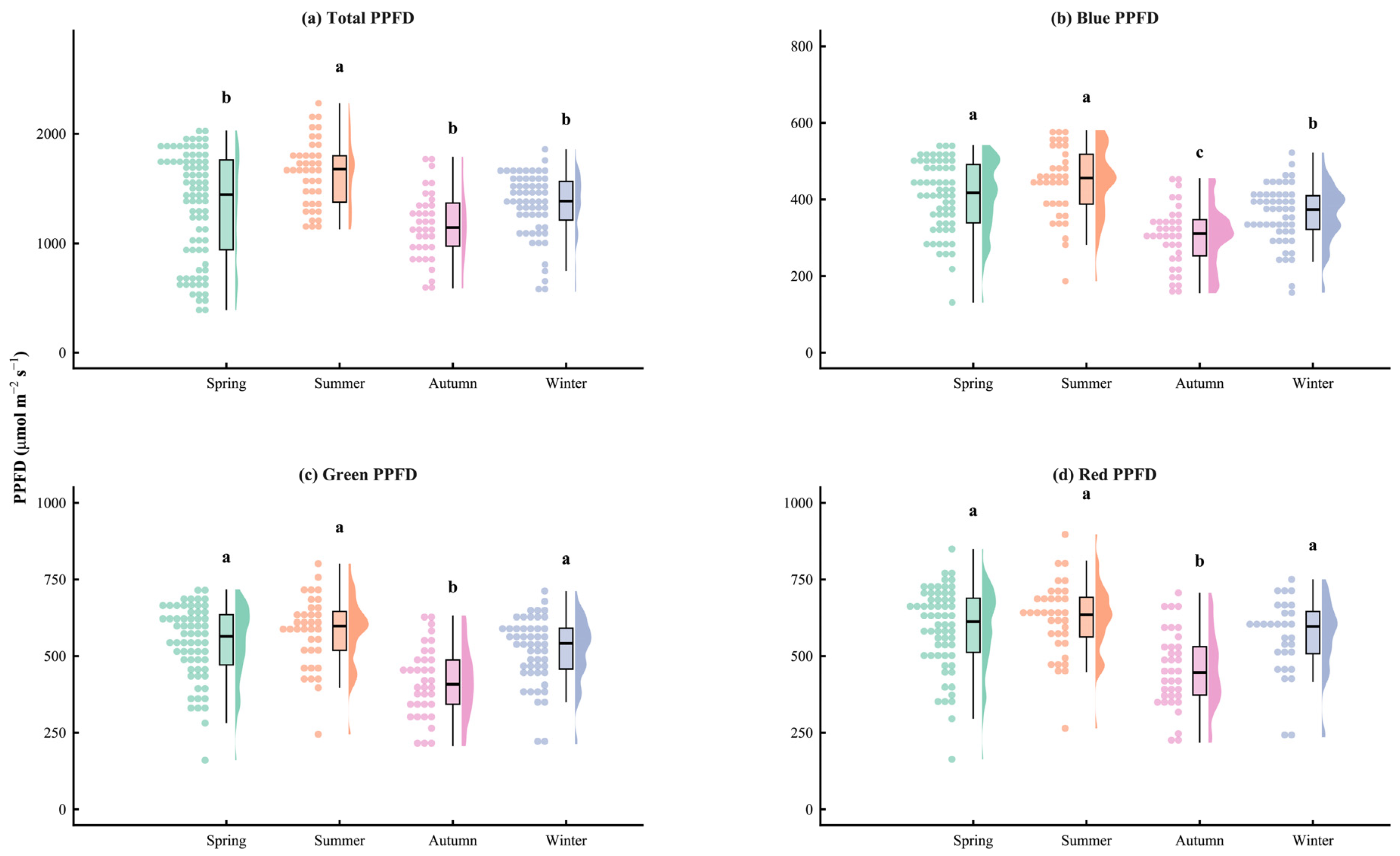 | PPFD | Photosynthetic photon flux density | μmol m−2 s−1 |