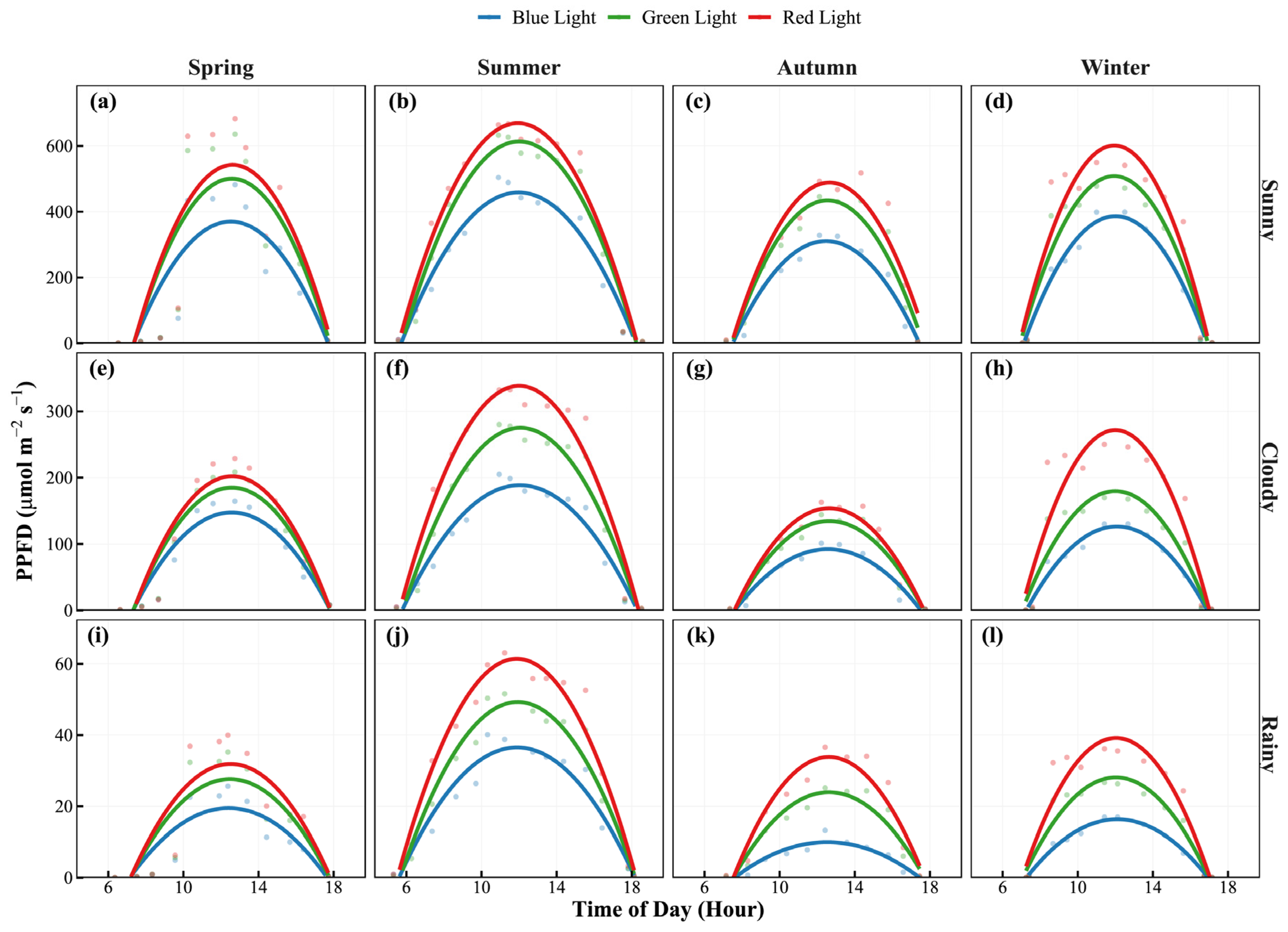 | A | Cumulative daily solar photons per unit area (Area under PPFD curve) | μmol m−2 day−1 |