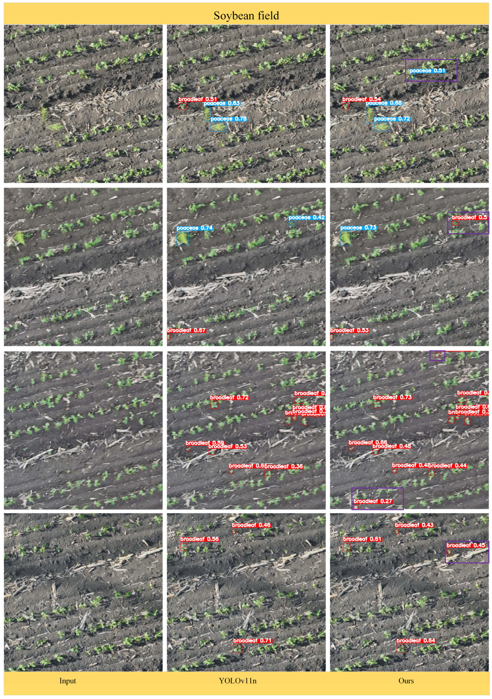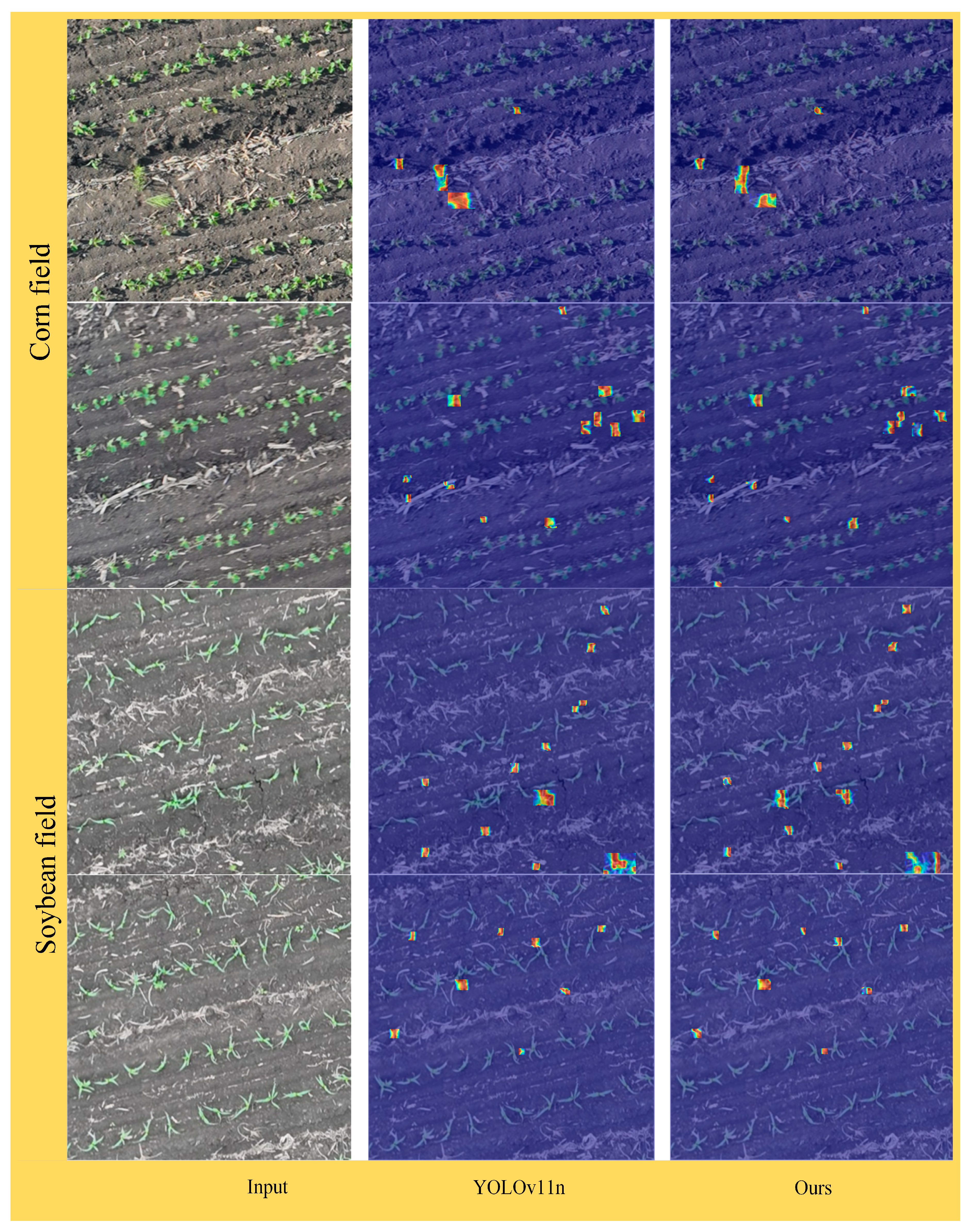 - Yue, Y.; Zhao, A. Soybean Seedling-Stage Weed Detection and Distribution Mapping Based on Low-Altitude UAV Remote Sensing and an Improved YOLOv11n Model. Agronomy 2025, 15, 2693. [Google Scholar] [CrossRef]