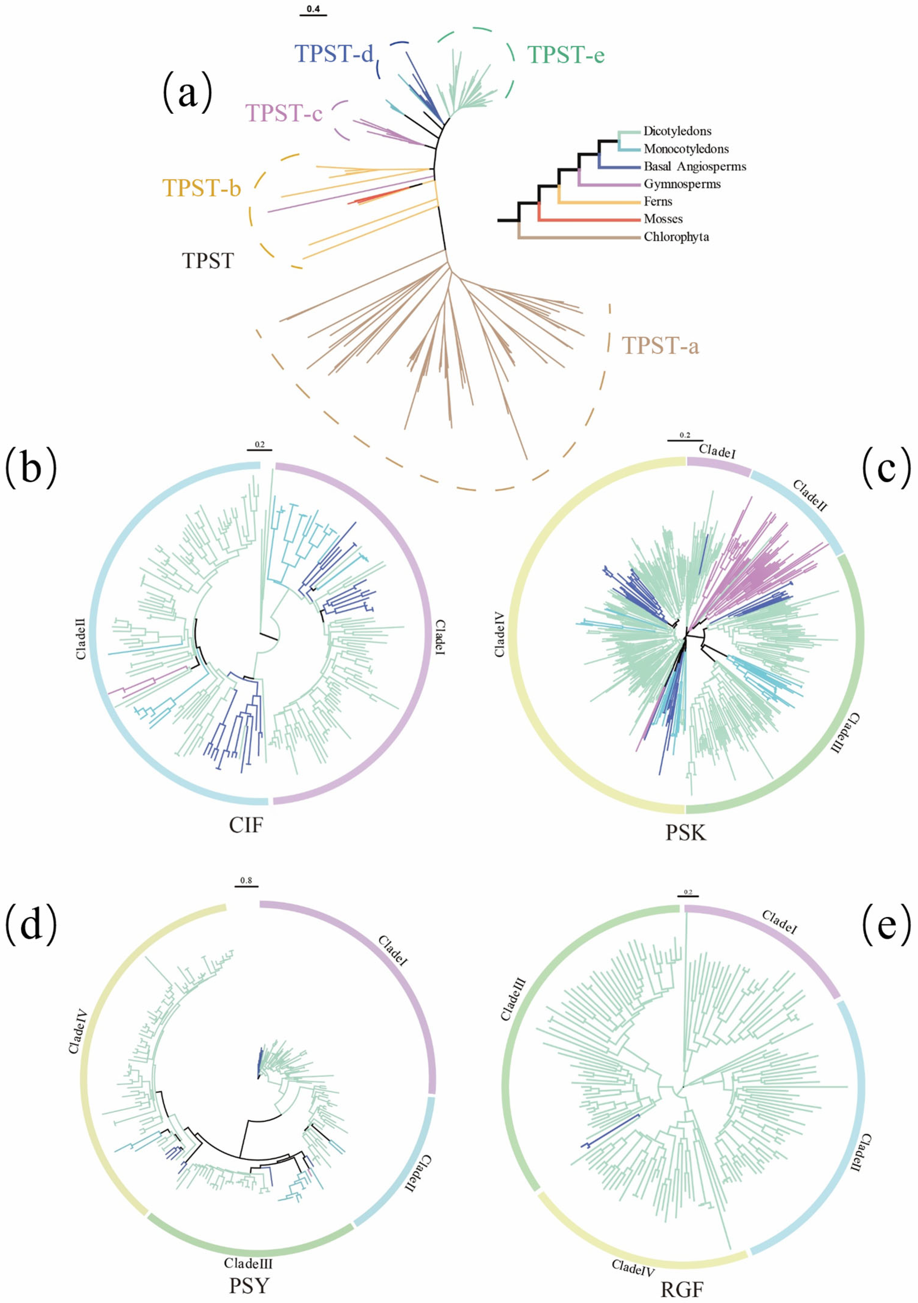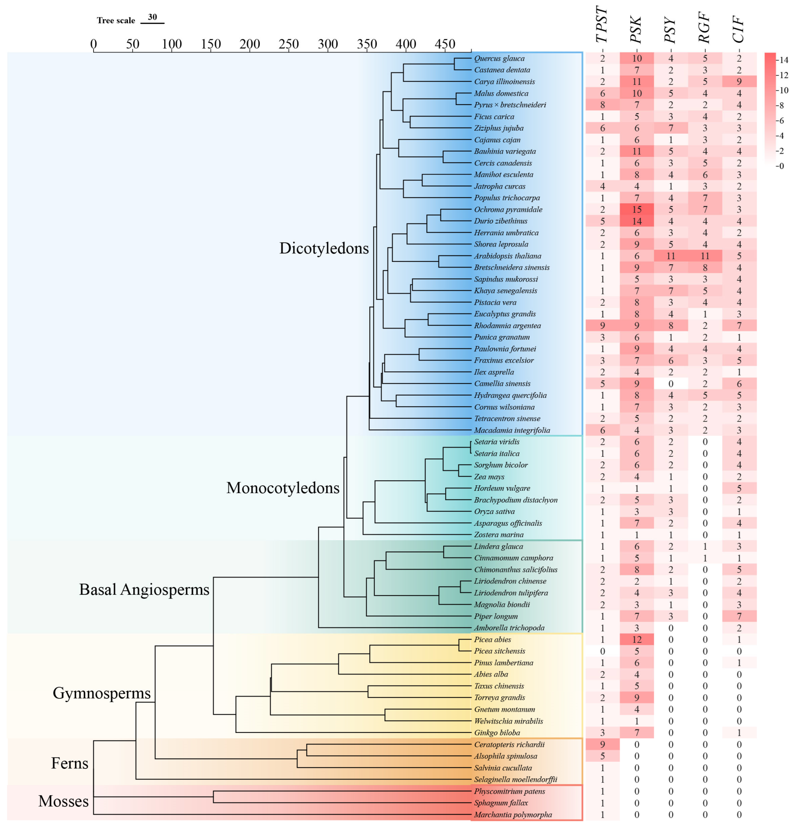 2.2. Phylogenetic Analyses of TPST, PSK, PSY, RGF, and CIF