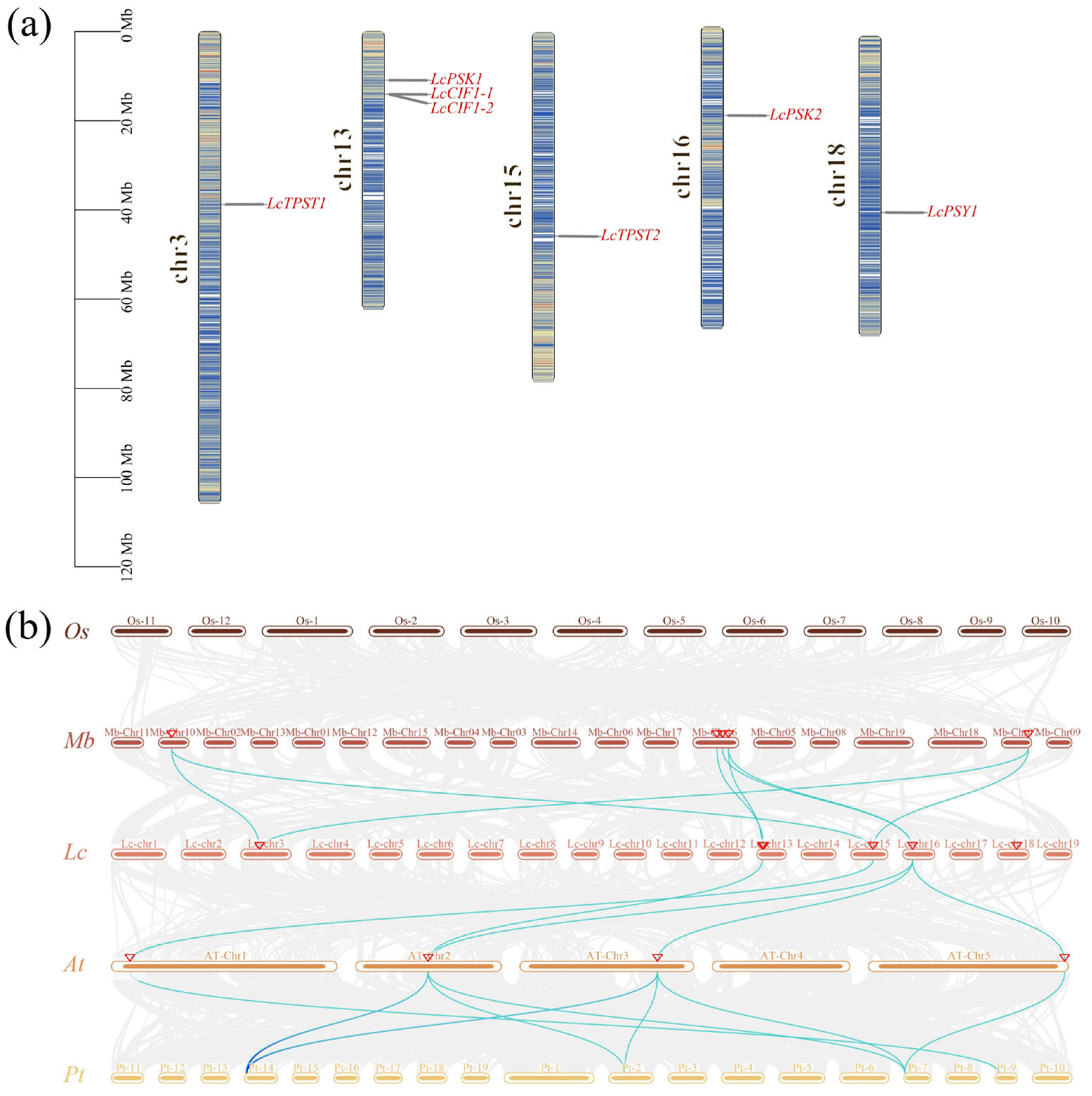 - Wang, Y.; Tang, H.; Debarry, J.D.; Tan, X.; Li, J.; Wang, X.; Lee, T.-H.; Jin, H.; Marler, B.; Guo, H.; et al. MCScanX: A Toolkit for Detection and Evolutionary Analysis of Gene Synteny and Collinearity. Nucleic Acids Res. 2012, 40, e49. [Google Scholar] [CrossRef] [PubMed]