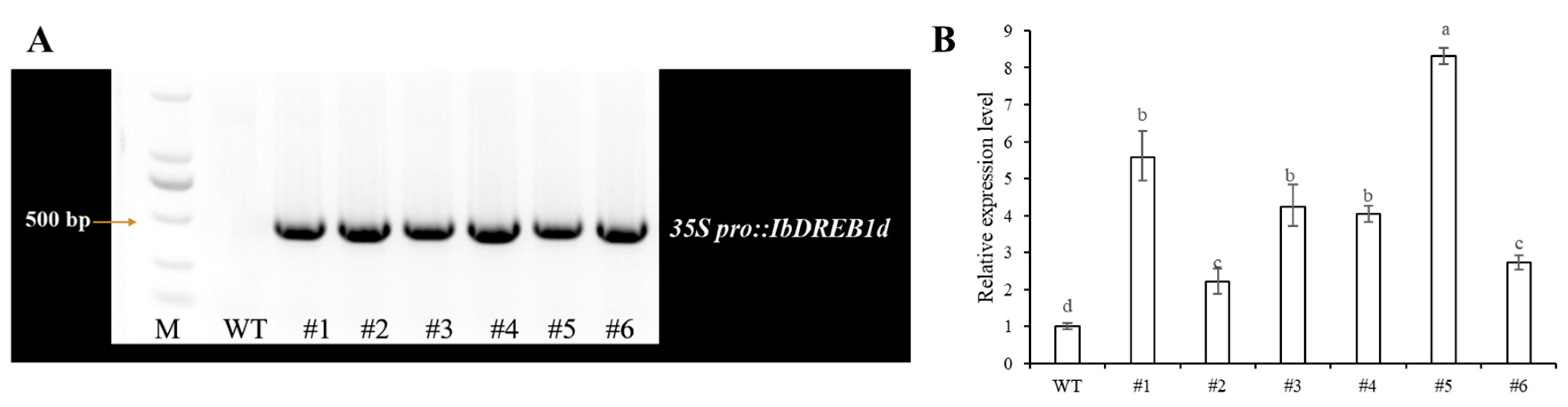 3.3. Generation of IbDREB1d-Overexpressing Sweet Potato Plants