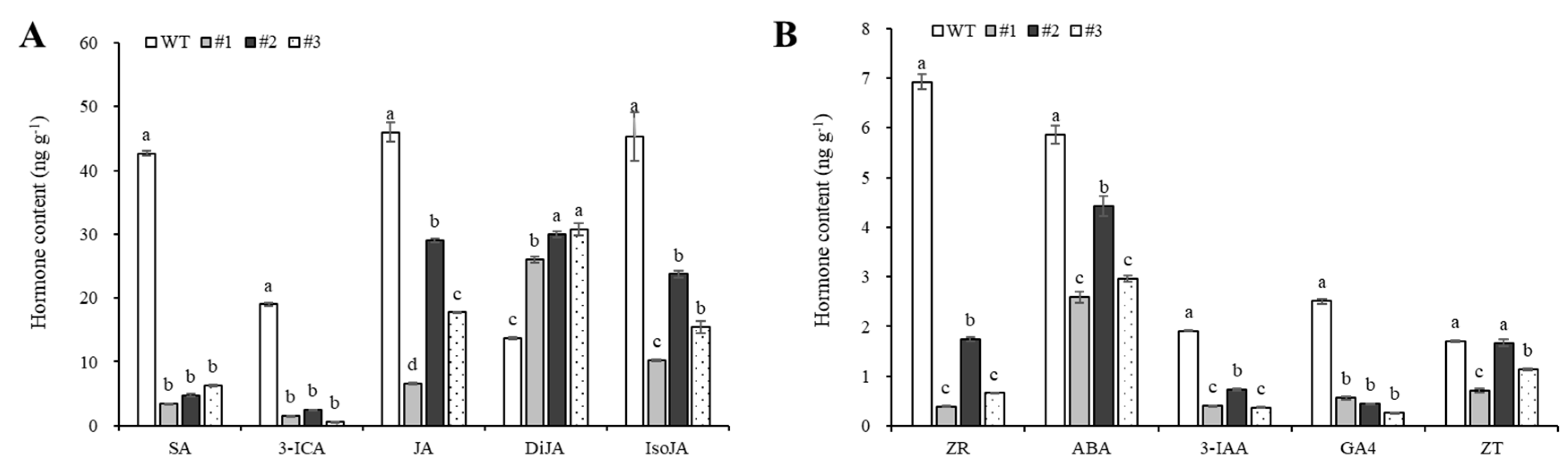 3.6. Comparative Analysis of Hormone Differences in Transgenic Plants