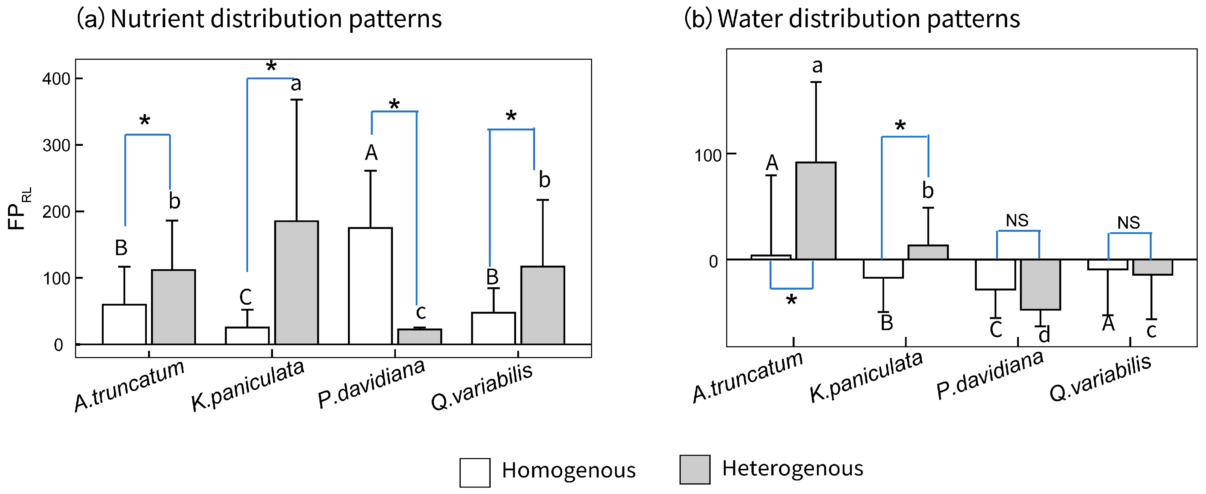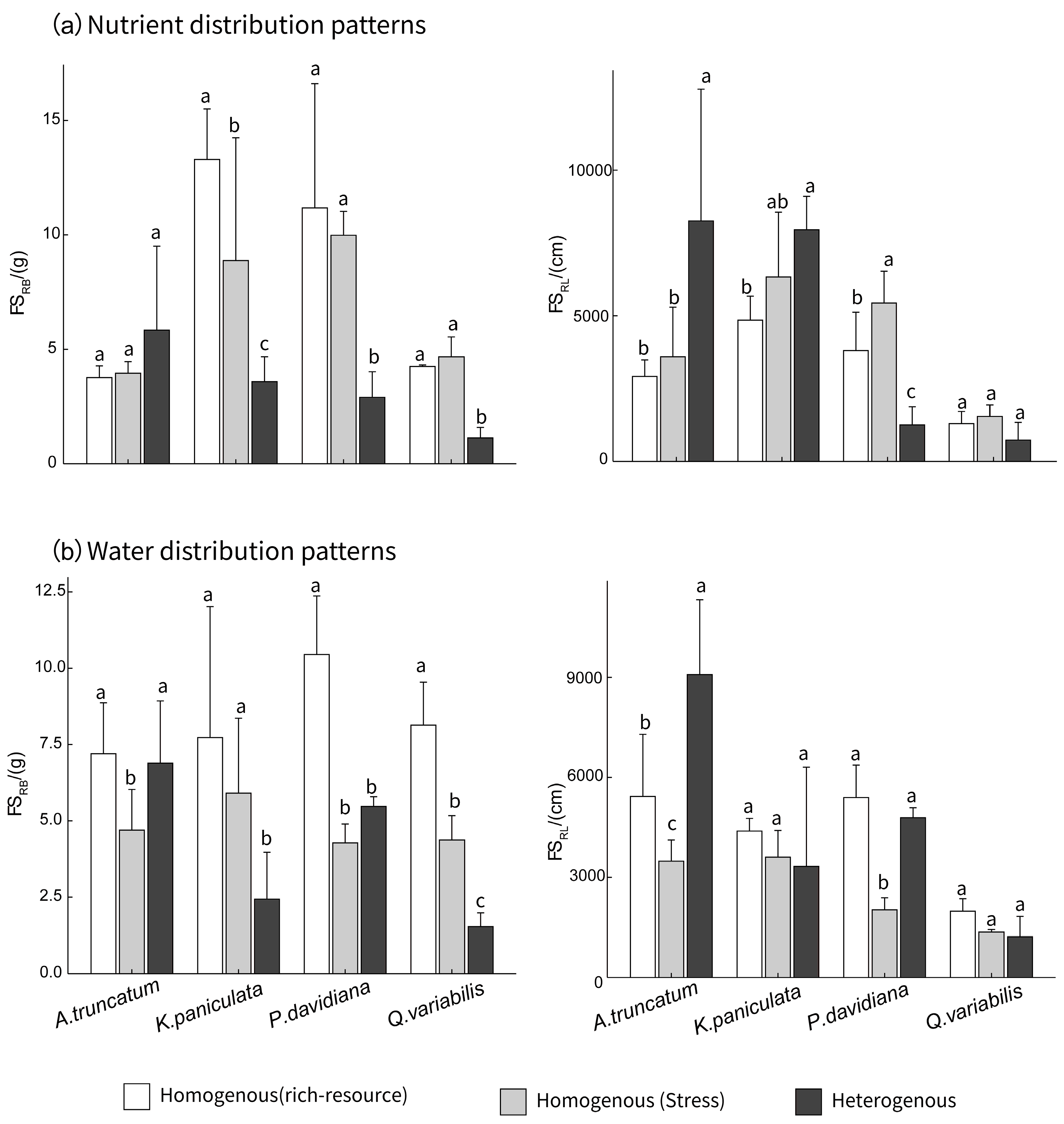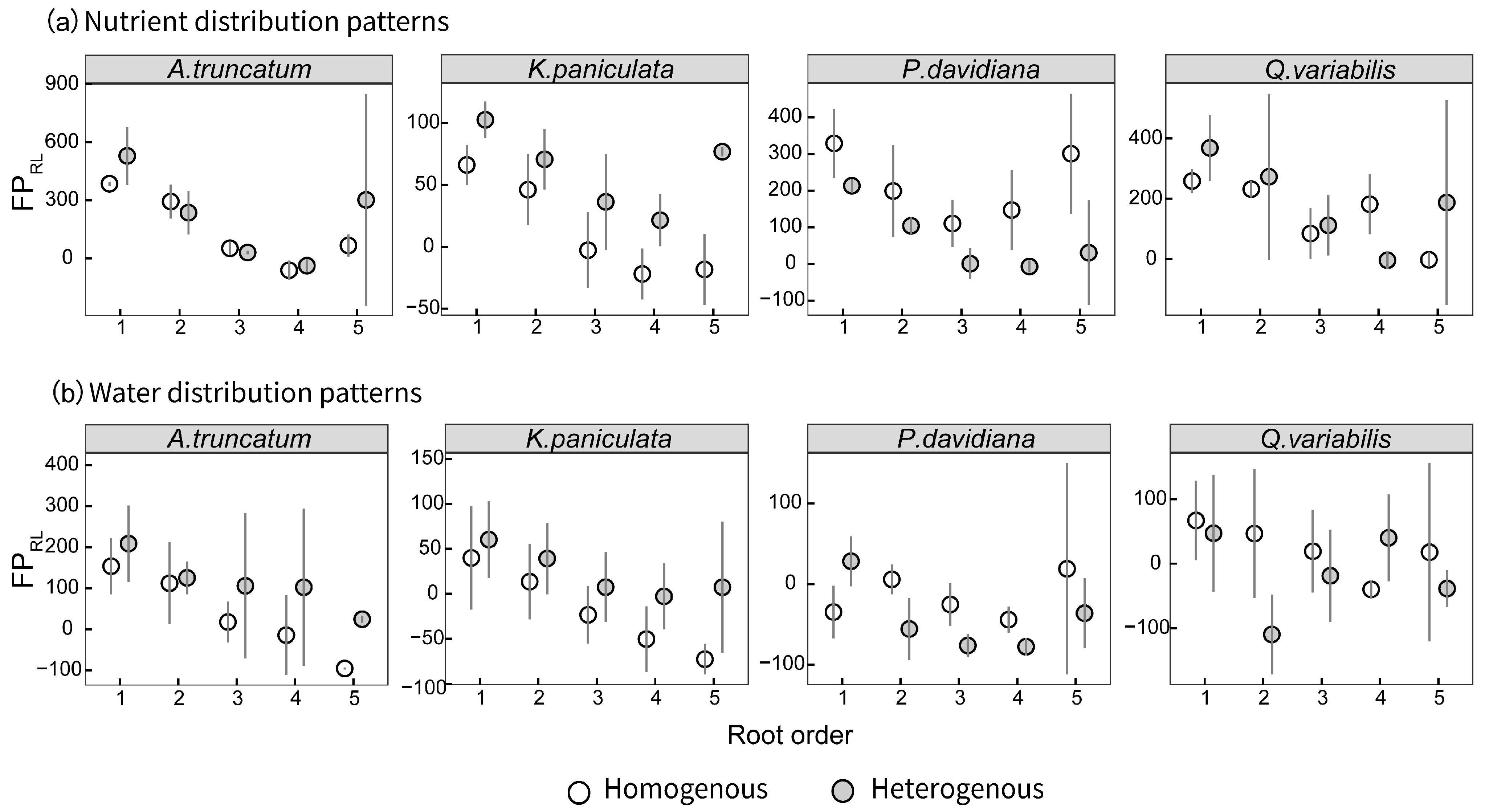 Wei, L.; Dong, T.; Lan, L.; Lin, J.; Li, X.; Yu, M.; Xu, C. Morphological Traits Shape Foraging Scale but Not Precision: Divergent Responses of Four Tree Species to Water and Nutrient Heterogeneity. Plants 2026, 15, 998. https://doi.org/10.3390/plants15070998