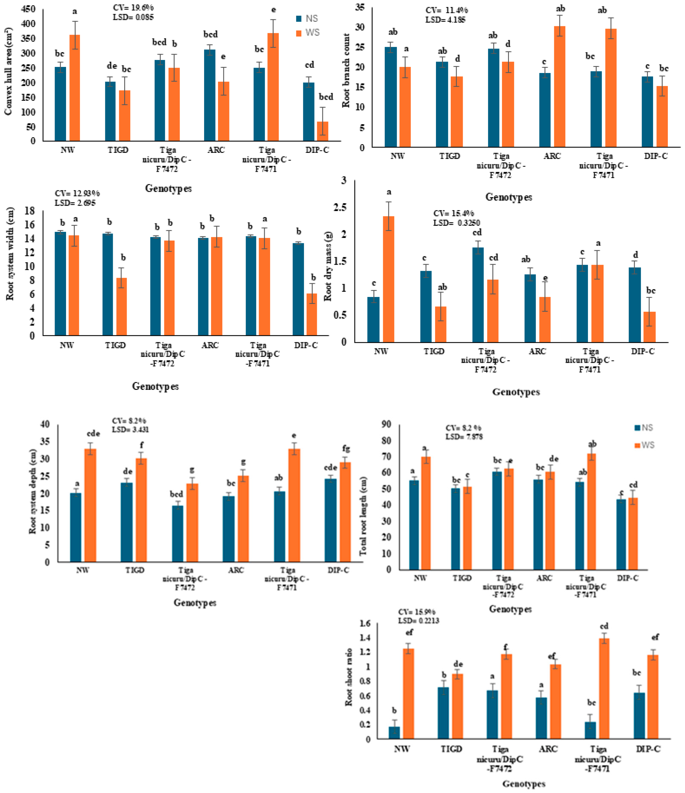 - Mateva, K.I.; Chai, H.H.; Mayes, S.; Massawe, F. Natural genotypic variation underpins root system response to drought stress in Bambara groundnut [Vigna subterranea (L.) Verdc.]. Front. Plant Sci. 2022, 13, 760879. [Google Scholar] [CrossRef]