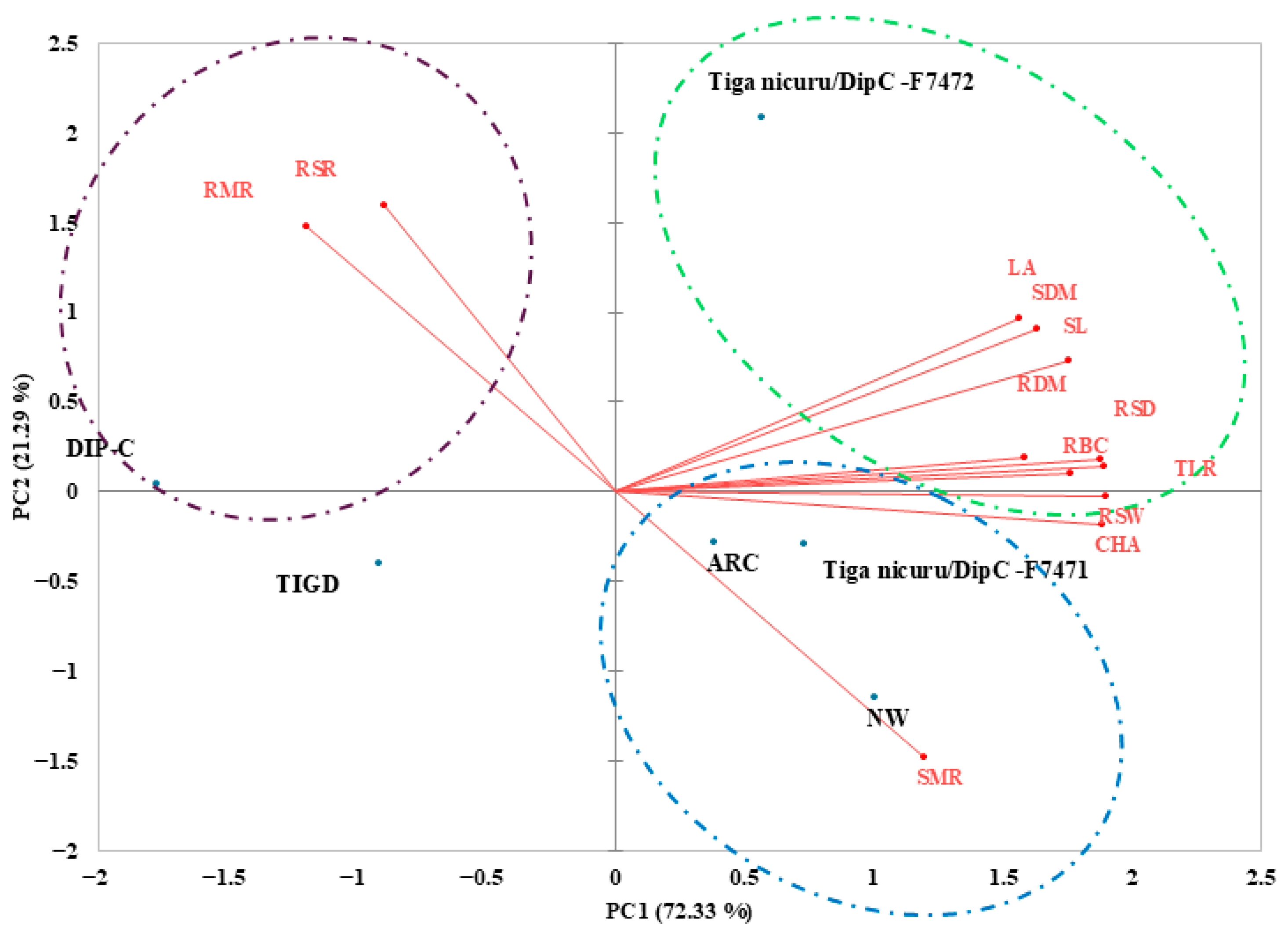 2.2. Principal Component Analysis (PCA) of Root and Shoot Traits