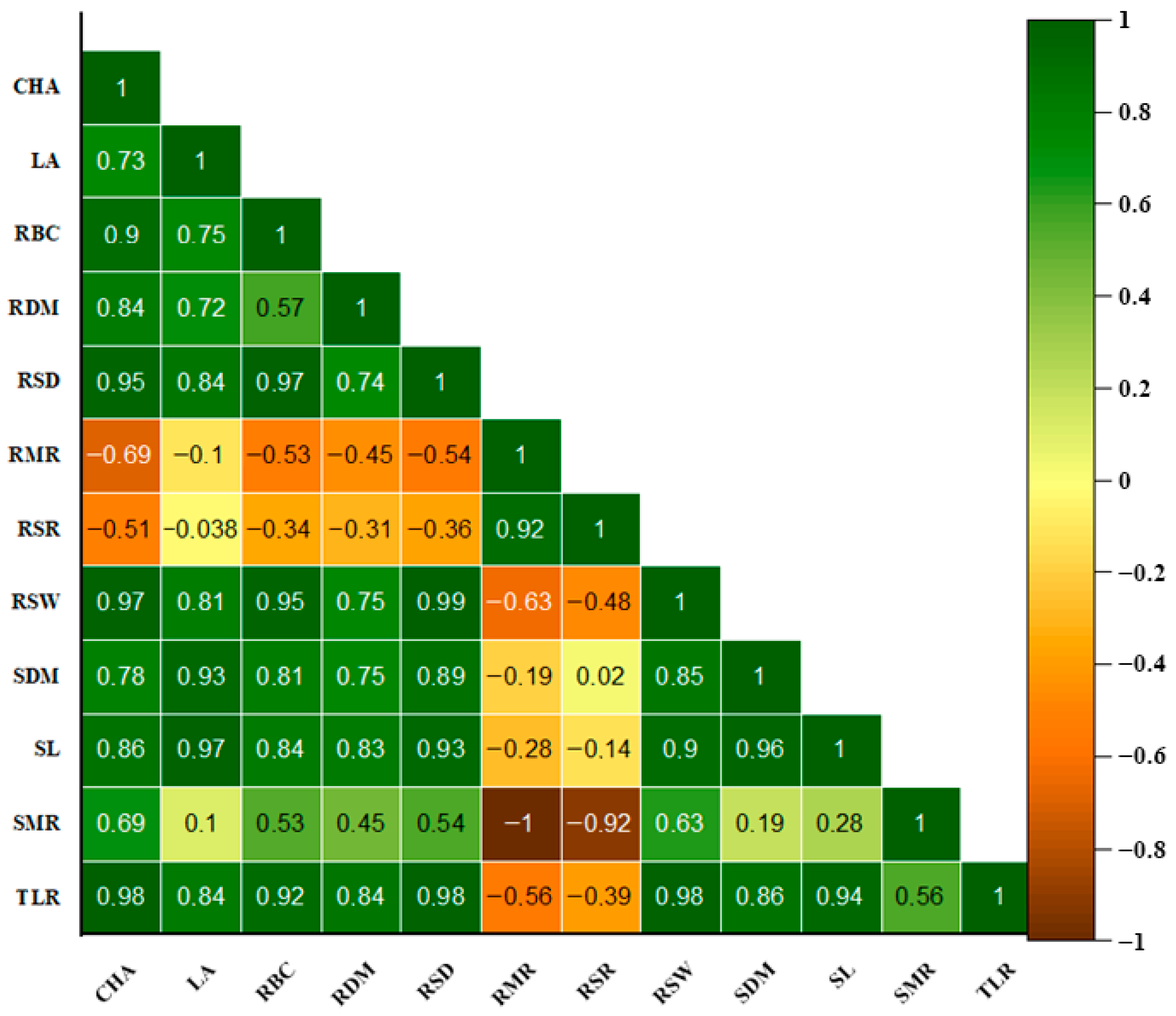 | Source of Variation | d.f | CHA | LA | RBC | RDM | RMR | RSD | RSR | RSW | SDM | SL | SMR | TRV | TRL |