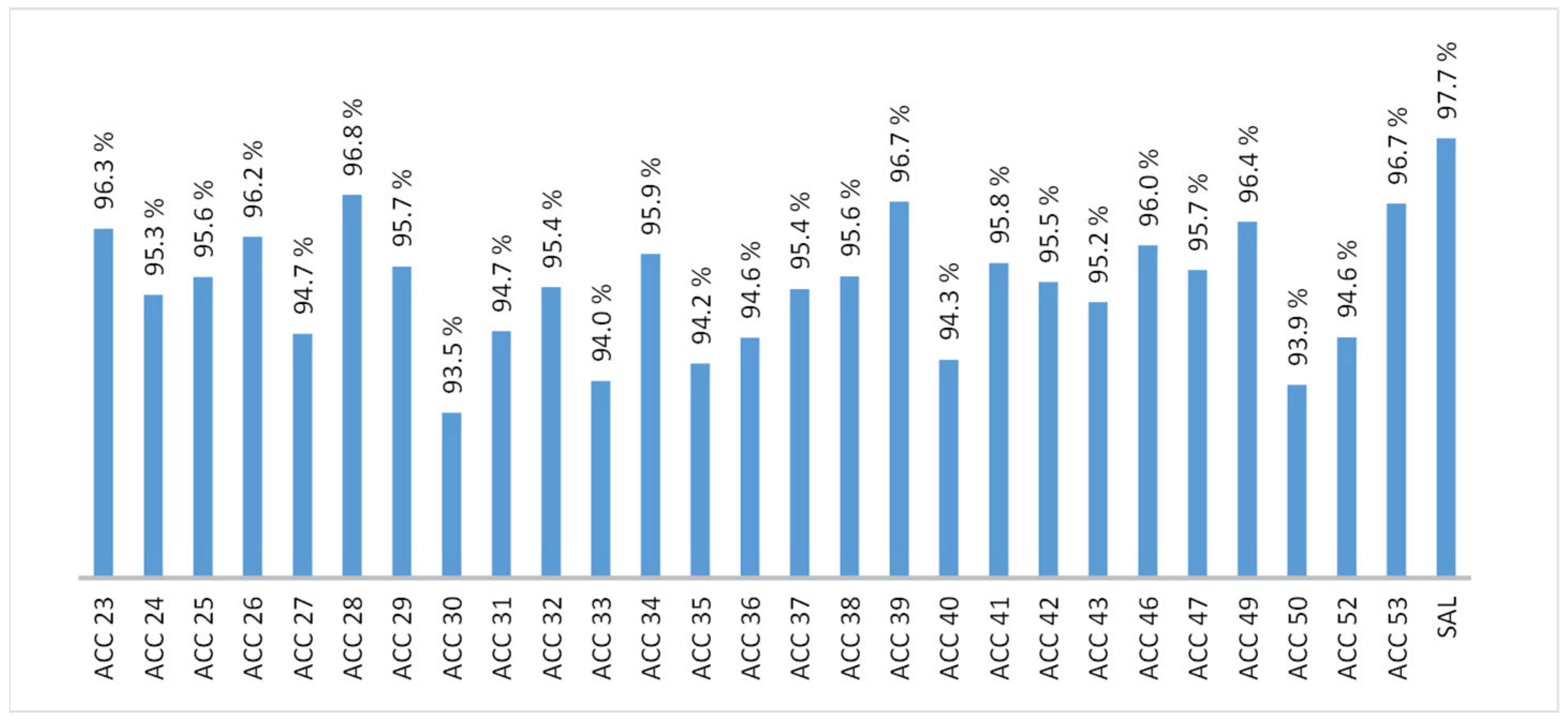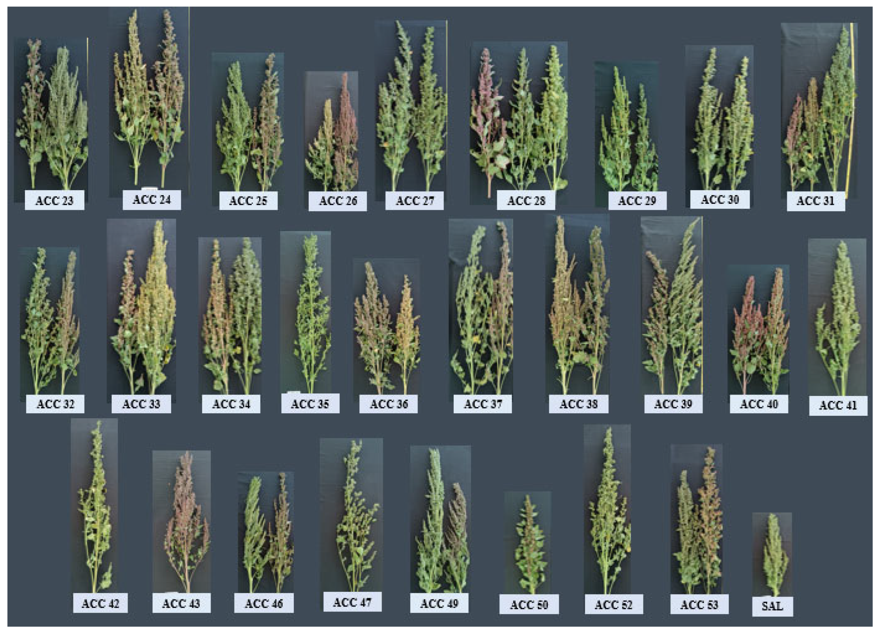 In terms of morphological characteristics, these lines matured at an average of 120 DAS, ranging from very early accessions like ACC 50 at 105 DAS and late ones like ACC 35, ACC 37, ACC 43, and SAL that matured by 132 DAS. We also identified lines with outstanding characteristics like ACC 29 and ACC 50, which stood out for their earliness, short stature, low saponin content, and superior productivity in comparison with the commercial check variety ‘Salcedo INIA’. On the other hand, all of the accessions performed similarly in their simple growth habit, cylindrical stems, triangular and toothed leaves, presence of striae, lack of male sterility, lack of branching, and presence of saponin. For the remaining characteristics the accessions displayed variability.