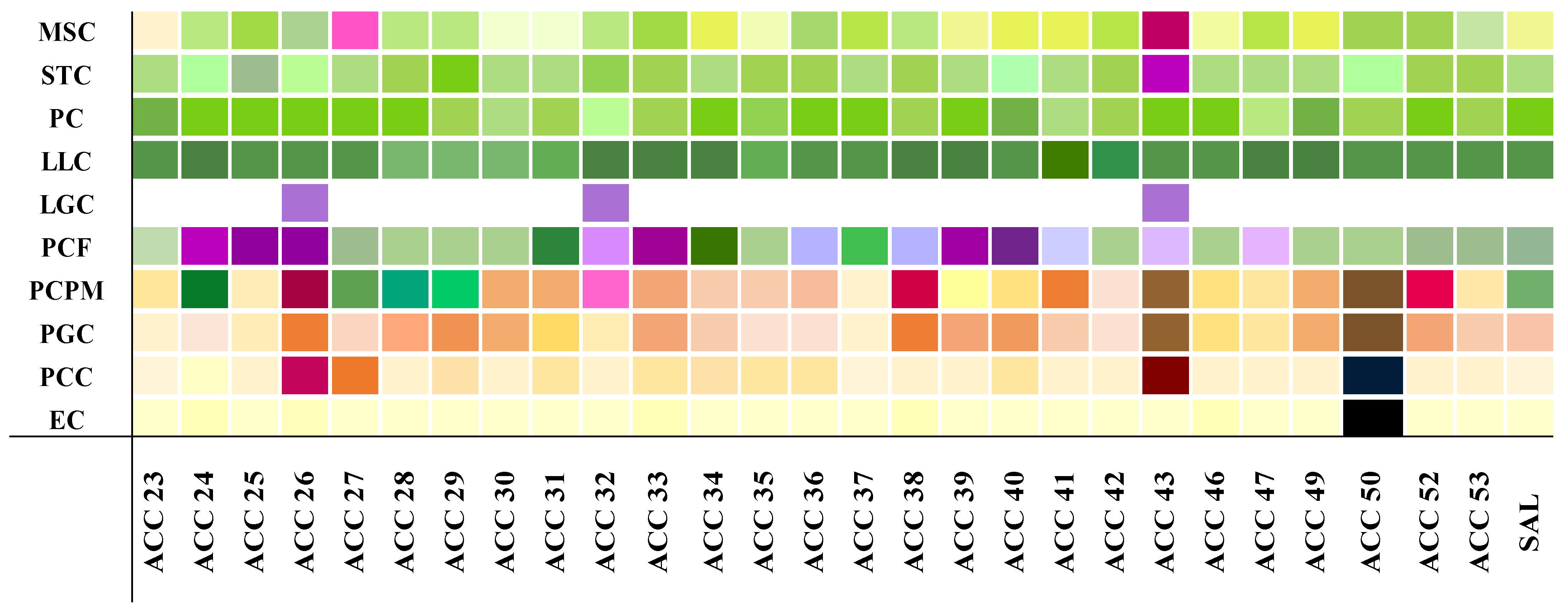 Colors of the main stem (MSC), striae (STC), petioles (PC), leaf blades (LLC), leaf granular trichomes (LGC), flowering panicles (PCF), plants at physiological maturity (PCPMs), perigonium (PGC), pericarp (PCC), and episperm (EC) were measured utilizing the Royal Horticultural Society color Chart, sixth edition (London, UK, 2015), with each color being numerically coded.