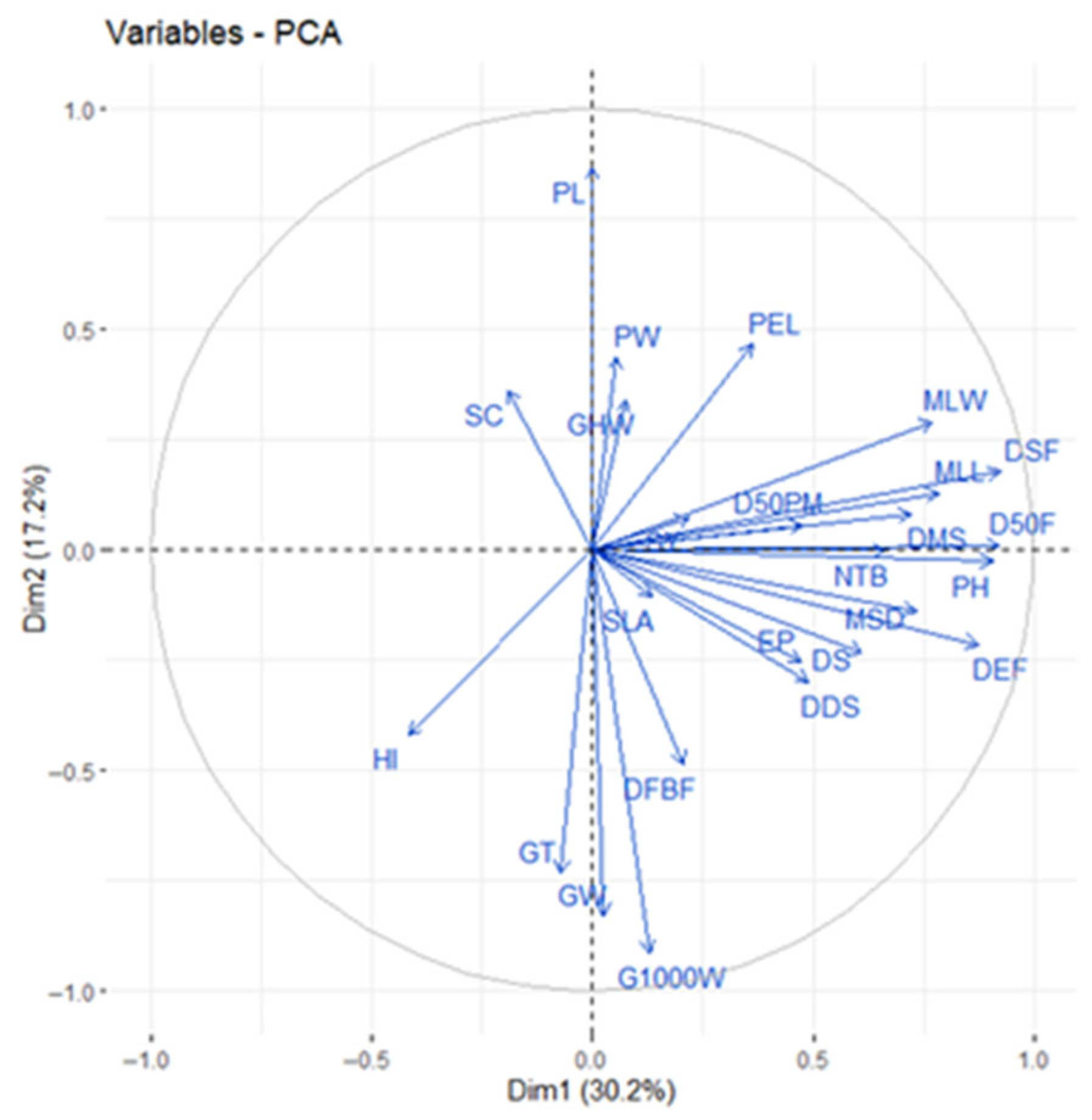 For the PCA, the first component encompassed 30.2% of the variability, explained primarily by the variables D50F, PH, DEF, DSF, MLL, DMS, DS, and MLW, whose vectors projected toward the positive pole of the axis and which comprise lines that were taller, with greater vegetative biomass, later maturity, and higher disease susceptibility. The second component of the PCA accounted for 17.2% of the variability, associated primarily with PL and PW, complementing the contributions of HI, DFBF, GT, GW, and G1000W. The extreme positive axis grouped lines have large panicles, while the negative axis contained lines showing higher productivity. Others [