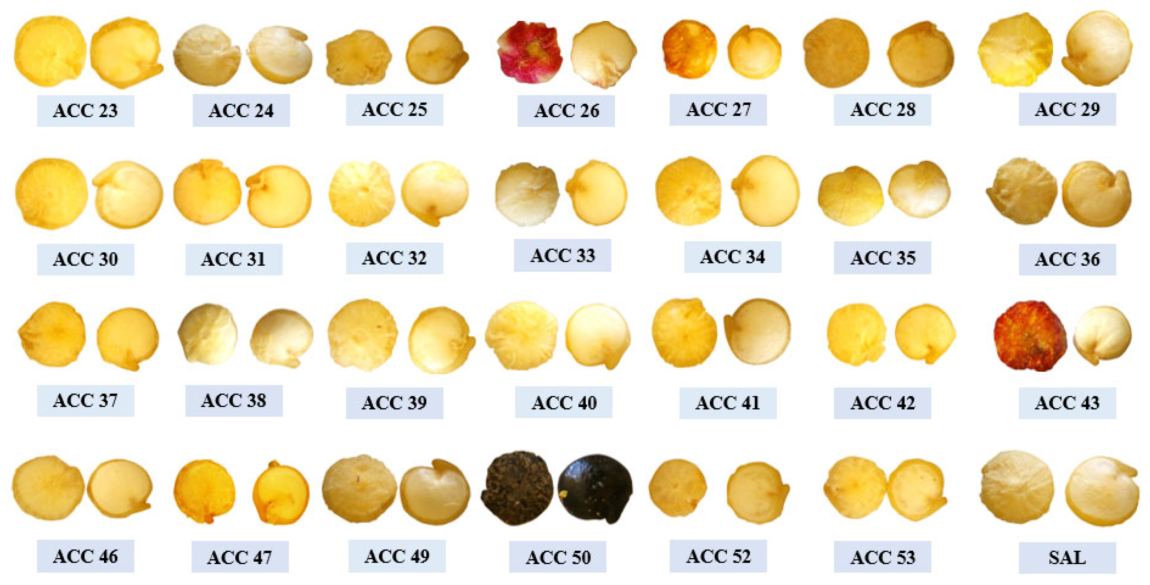 46] who reported 100% of their lines as being opaque. In terms of seed shape, 54% were cylindrical, 42% elliptical, and 4% were lenticular, which differed from [