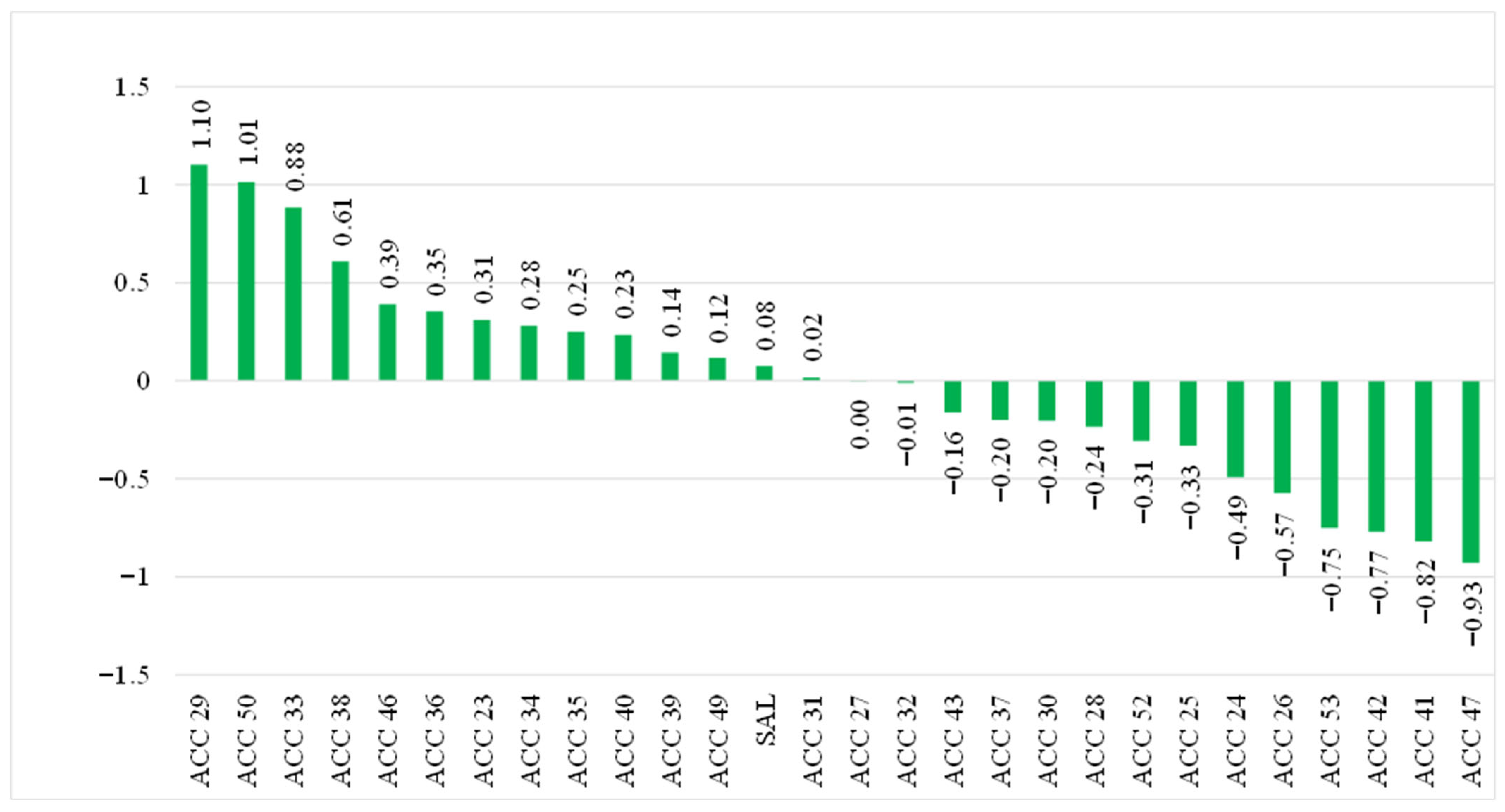 The selection indices of the 27 accessions and varietal check Salcedo-INIA varied between 1.10 and −0.93, with four accessions having the highest SI values (ACC 29, ACC 50, ACC33, and ACC 38) due to their combination of high yields, short statures, larger seeds, earliness, and lower saponin contents. In contrast, another study [