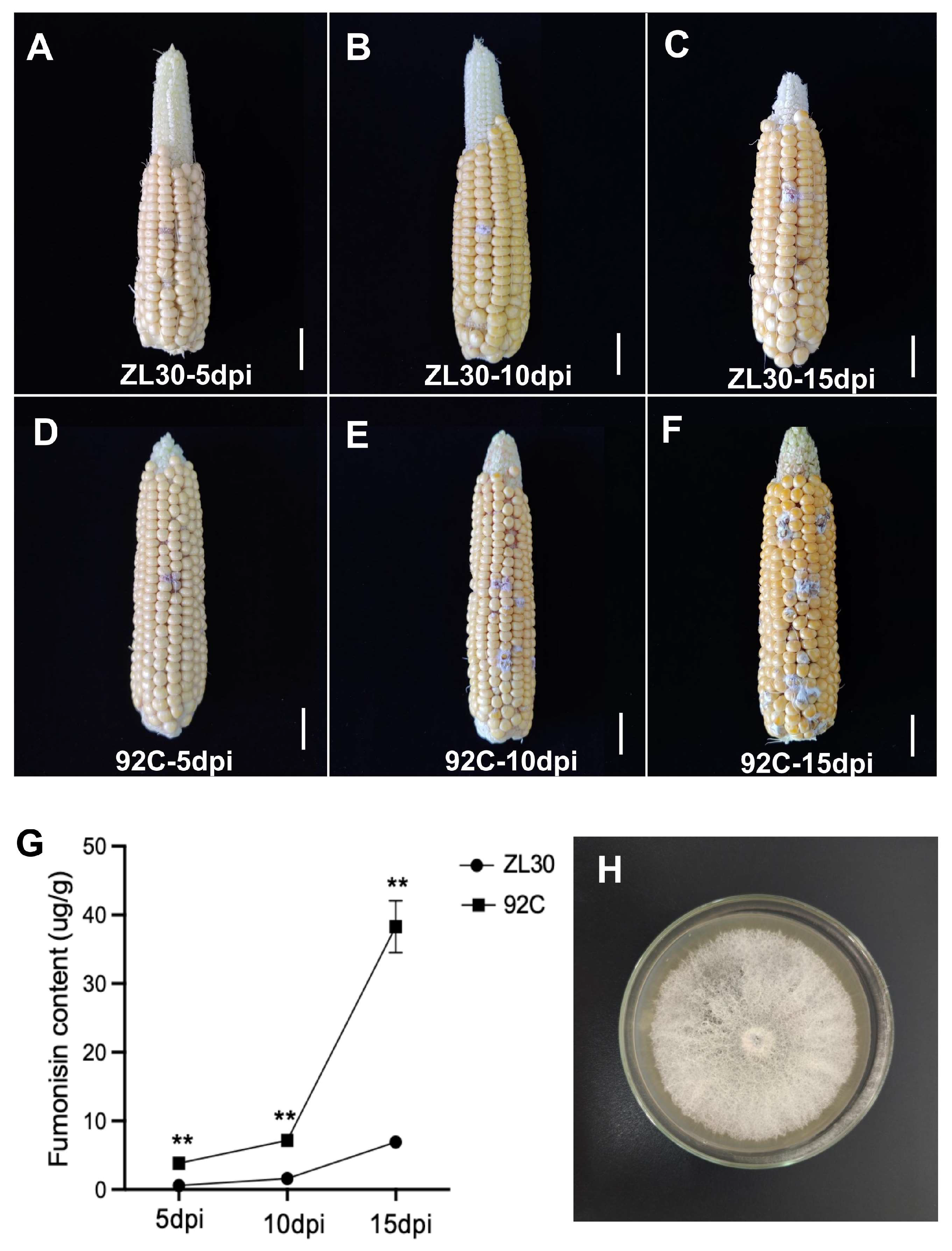 2.1. Resistance Evaluation and Fumonisin Analysis of ZL30 and 92C