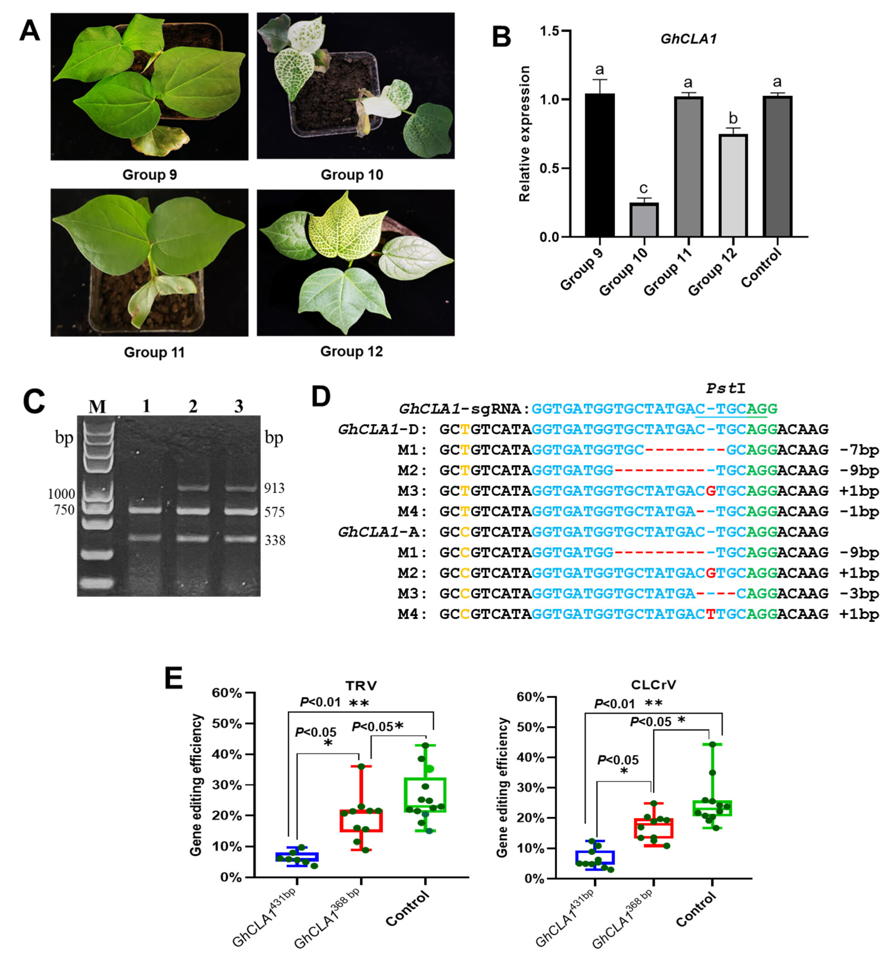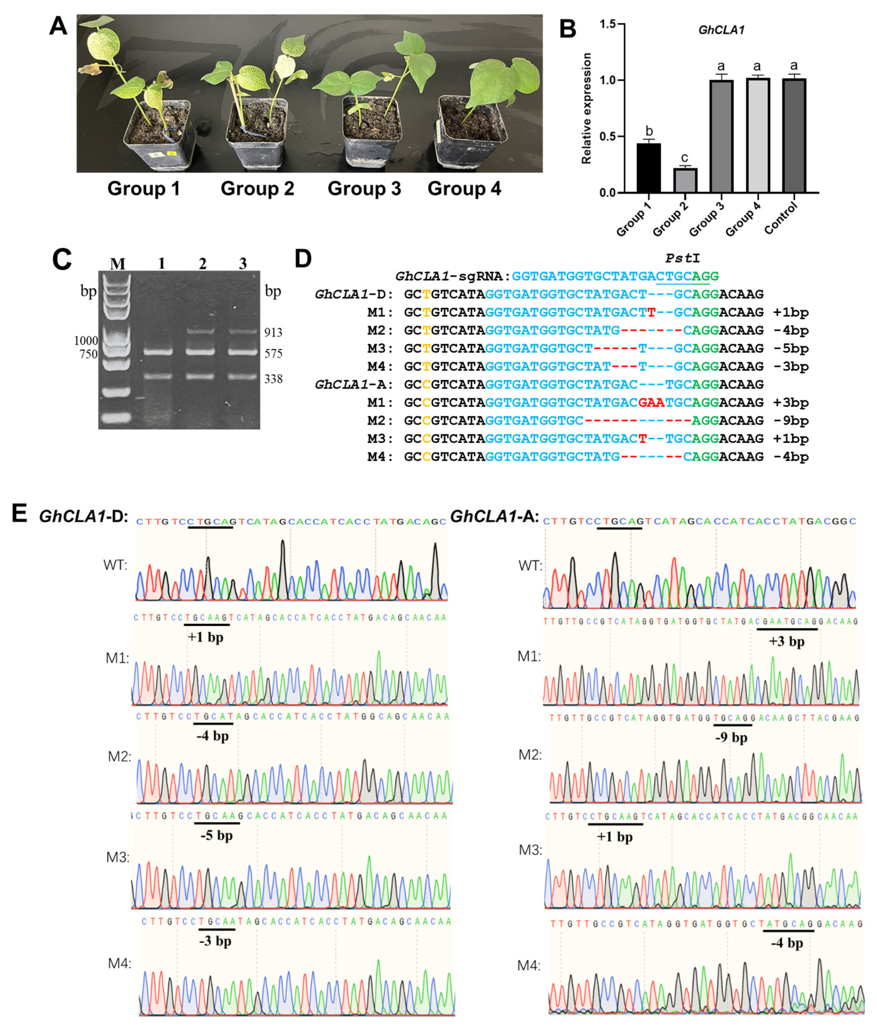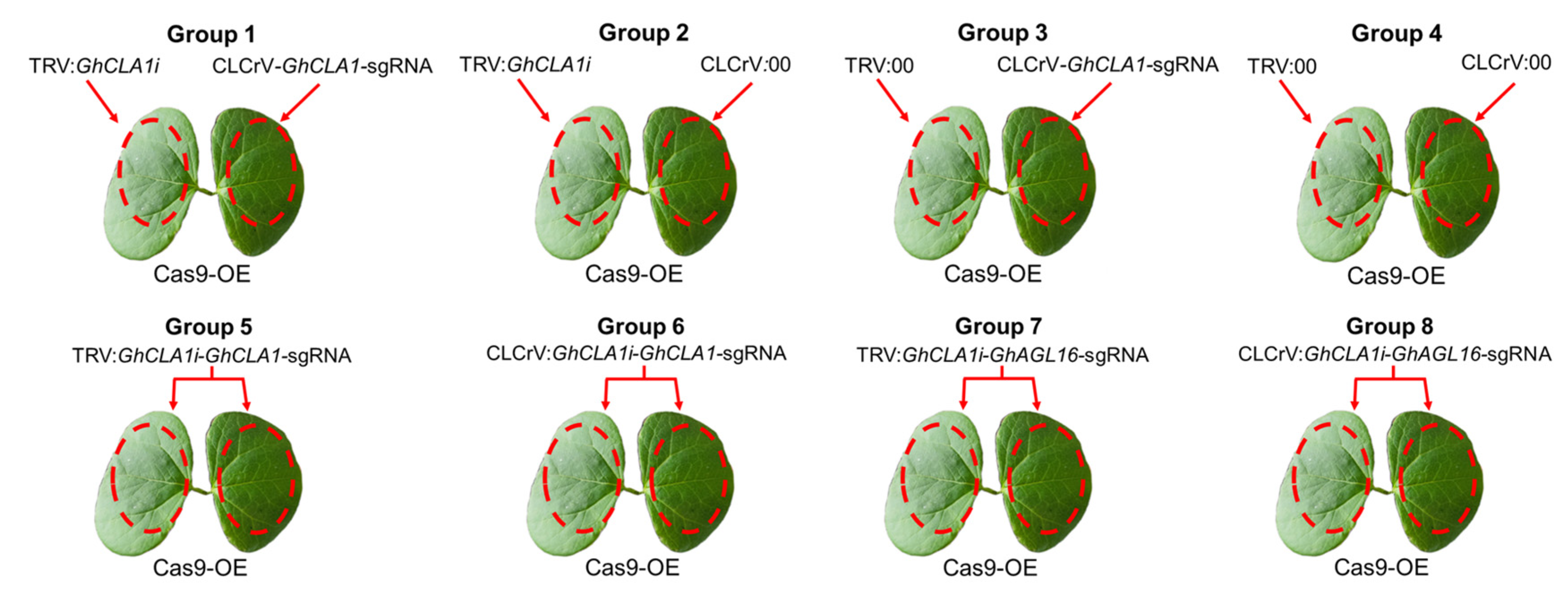 3.1. Feasibility Verification of Two Plant Viruses Simultaneously Achieving GhCLA1 Gene Silencing and Gene Editing