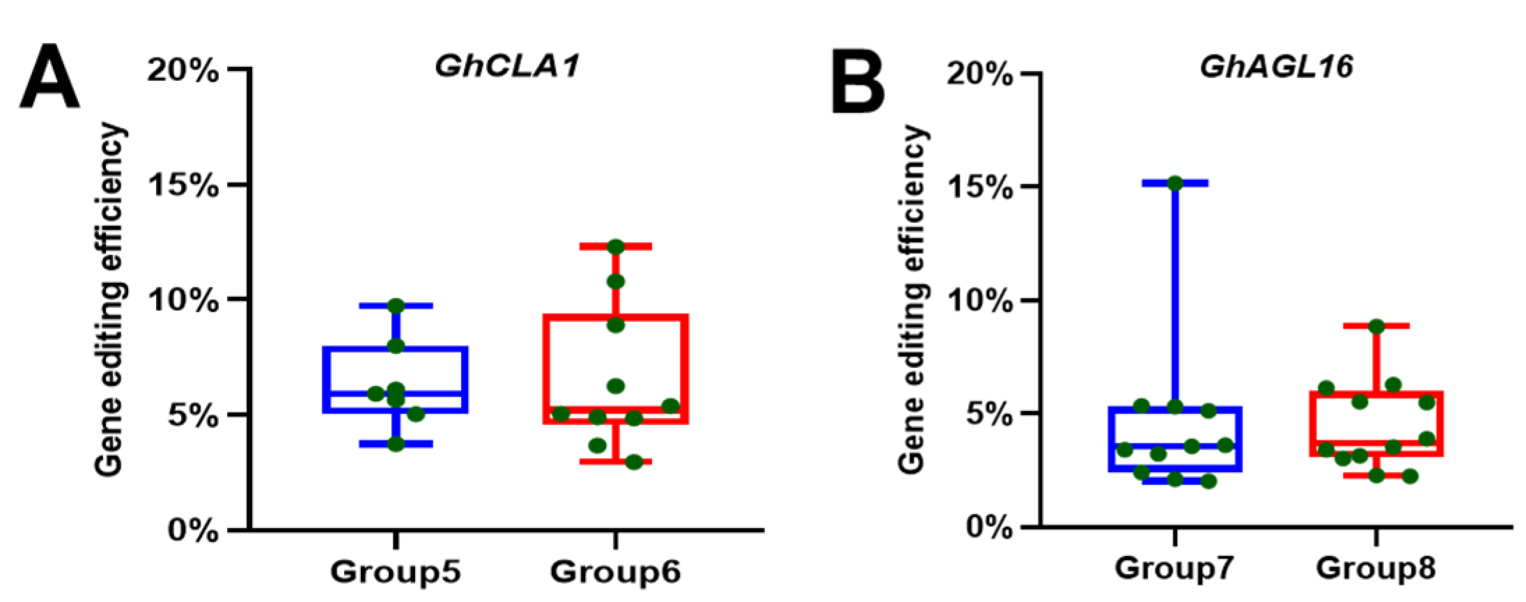 - Lei, J.F.; Li, Y.; Dai, P.H.; Liu, C.; Zhao, Y.; You, Y.Z.; Qu, Y.Y.; Chen, Q.J.; Liu, X.D. Efficient virus-mediated genome editing in cotton using the CRISPR/Cas9 system. Front. Plant Sci. 2022, 13, 1032799. [Google Scholar] [CrossRef]