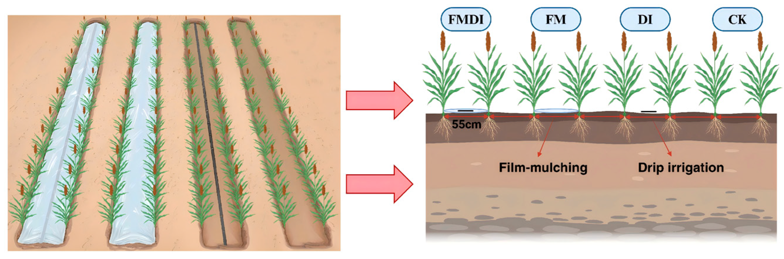 - Han, L.; Li, Y.; Zhu, J.; Zhou, Z.; Zhao, W.; Yang, Y.; Zhang, W.; Zhang, X.; Zhang, F. Long-term plastic film mulching increased maize yield and water use efficiency. Field Crops Res. 2025, 333, 110105. [Google Scholar] [CrossRef]