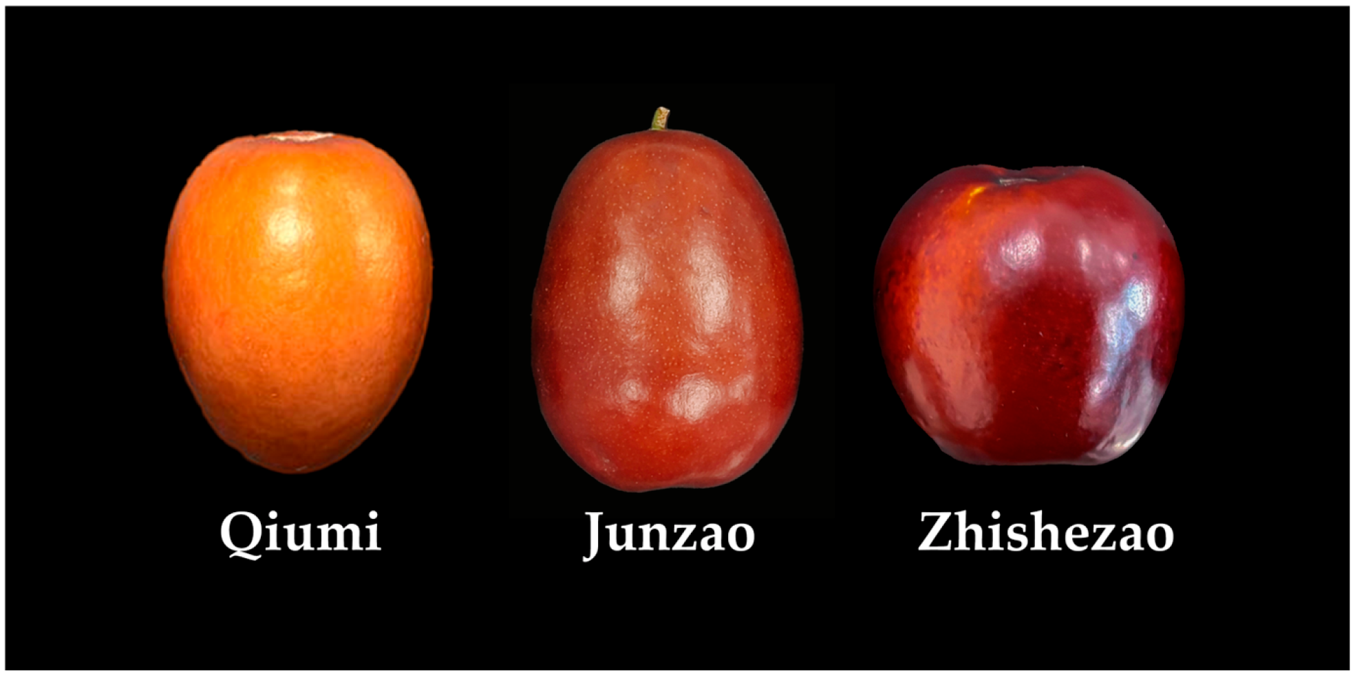 - Zhang, Q.; Wang, L.; Liu, Z.; Zhao, Z.; Zhao, J.; Wang, Z.; Zhou, G.; Liu, P.; Liu, M. Transcriptome and metabolome profiling unveil the mechanisms of Ziziphus jujuba Mill. peel coloration. Food Chem. 2020, 312, 125903. [Google Scholar] [CrossRef]