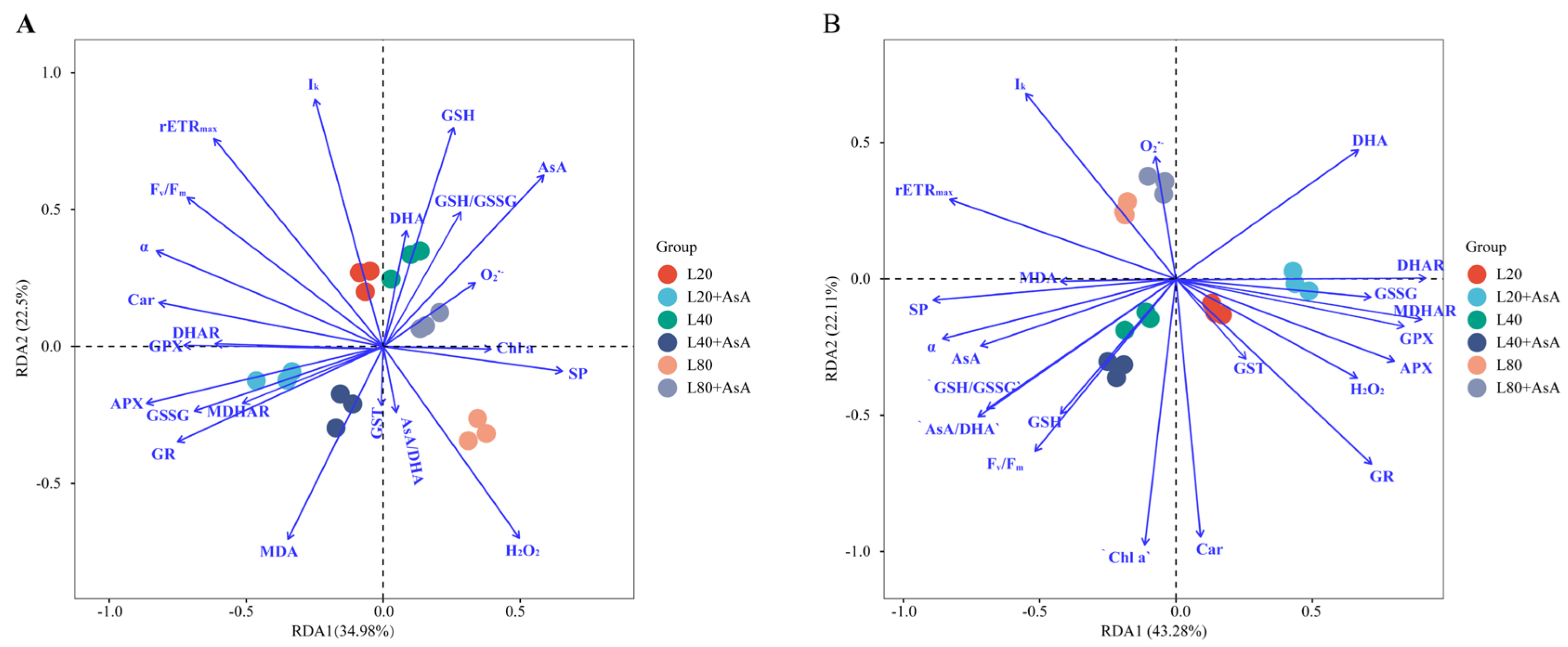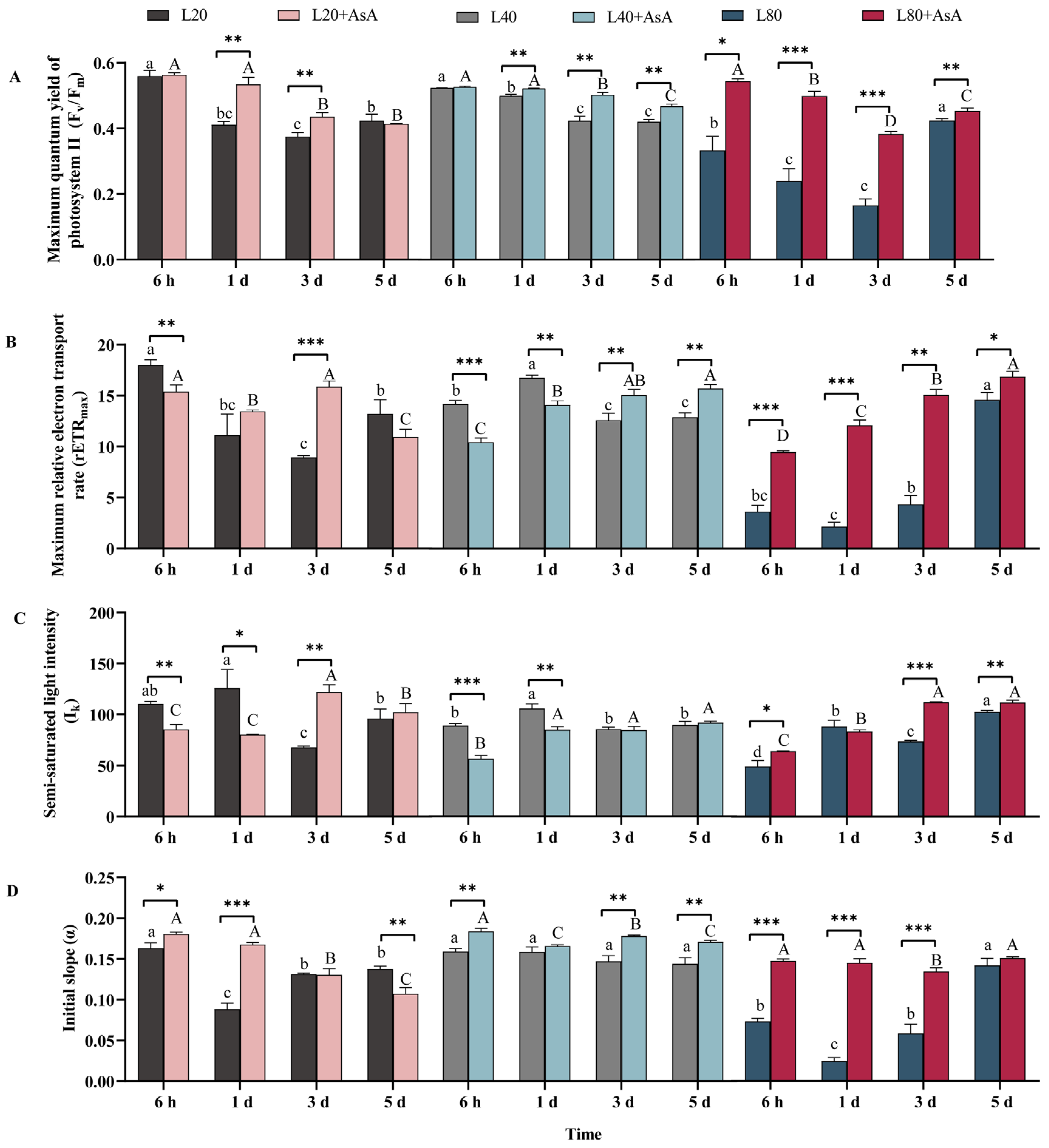 2.1. Chlorophyll Fluorescence Responses to Light Intensity and Exogenous AsA Treatment