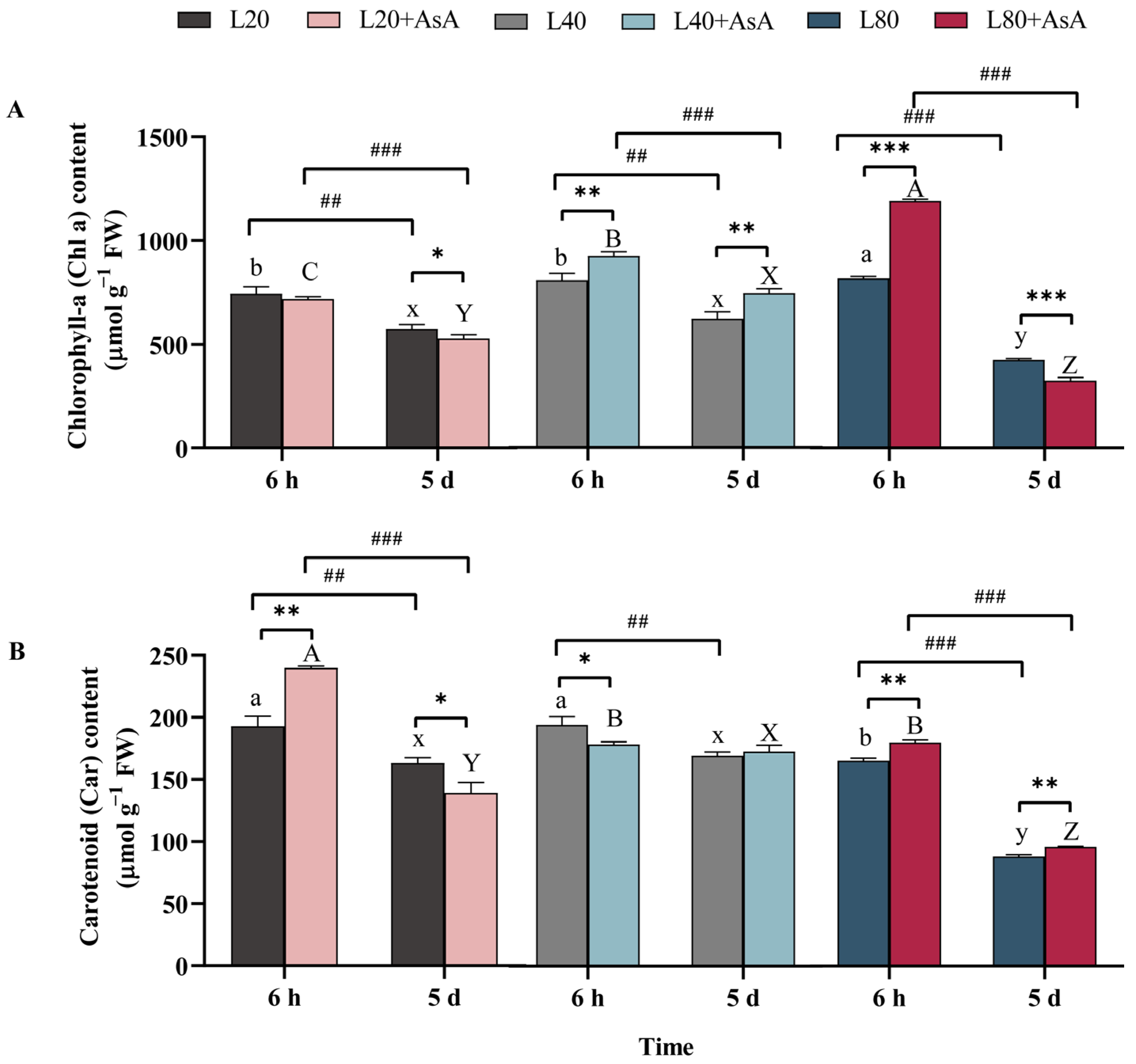 2.2. Light-Dependent Regulation of Chlorophyll-a and Carotenoid Accumulation and the Role of Exogenous AsA