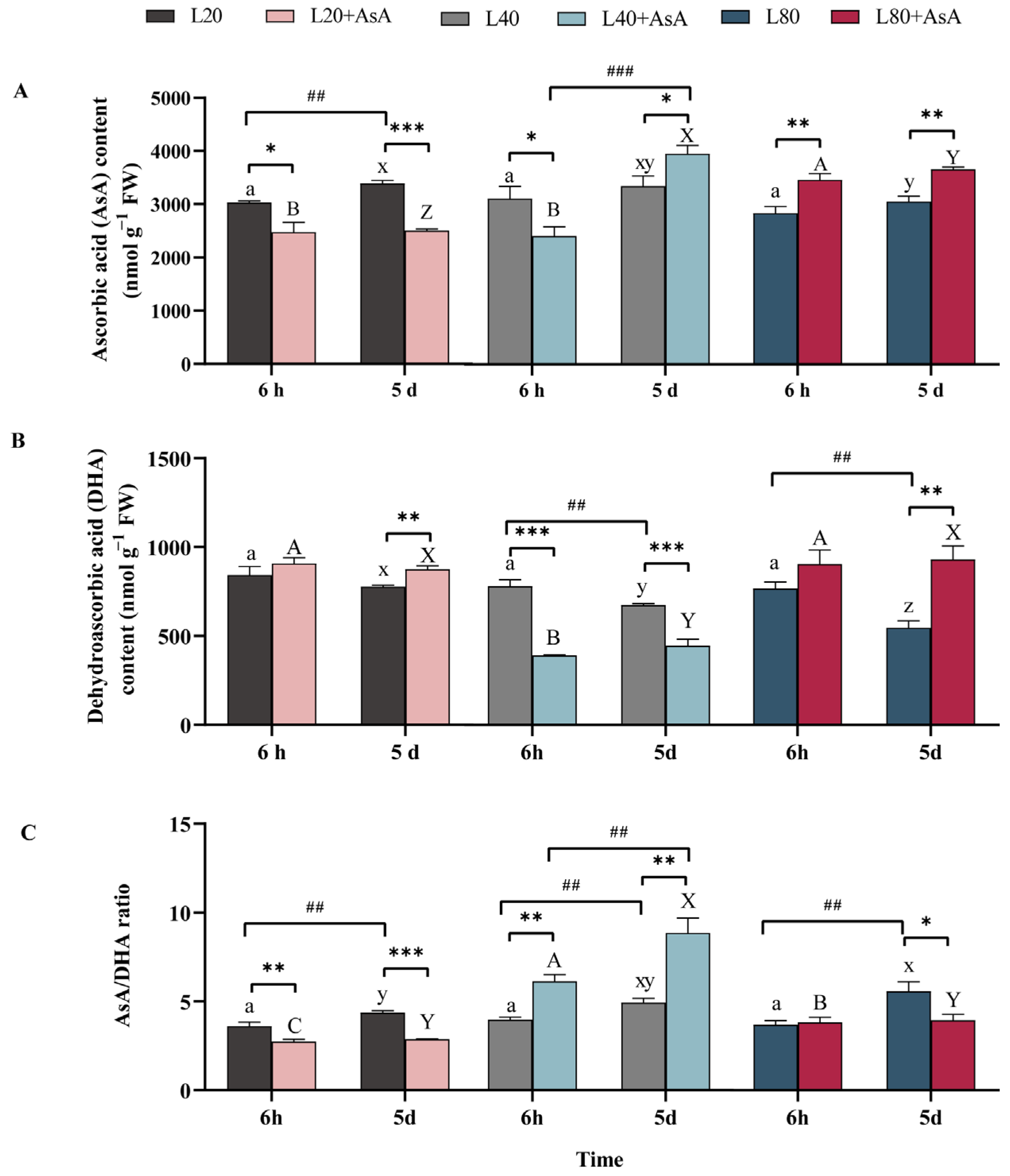 2.5. AsA-DHA Pool Dynamics and Redox State in Response to Light and AsA Treatments