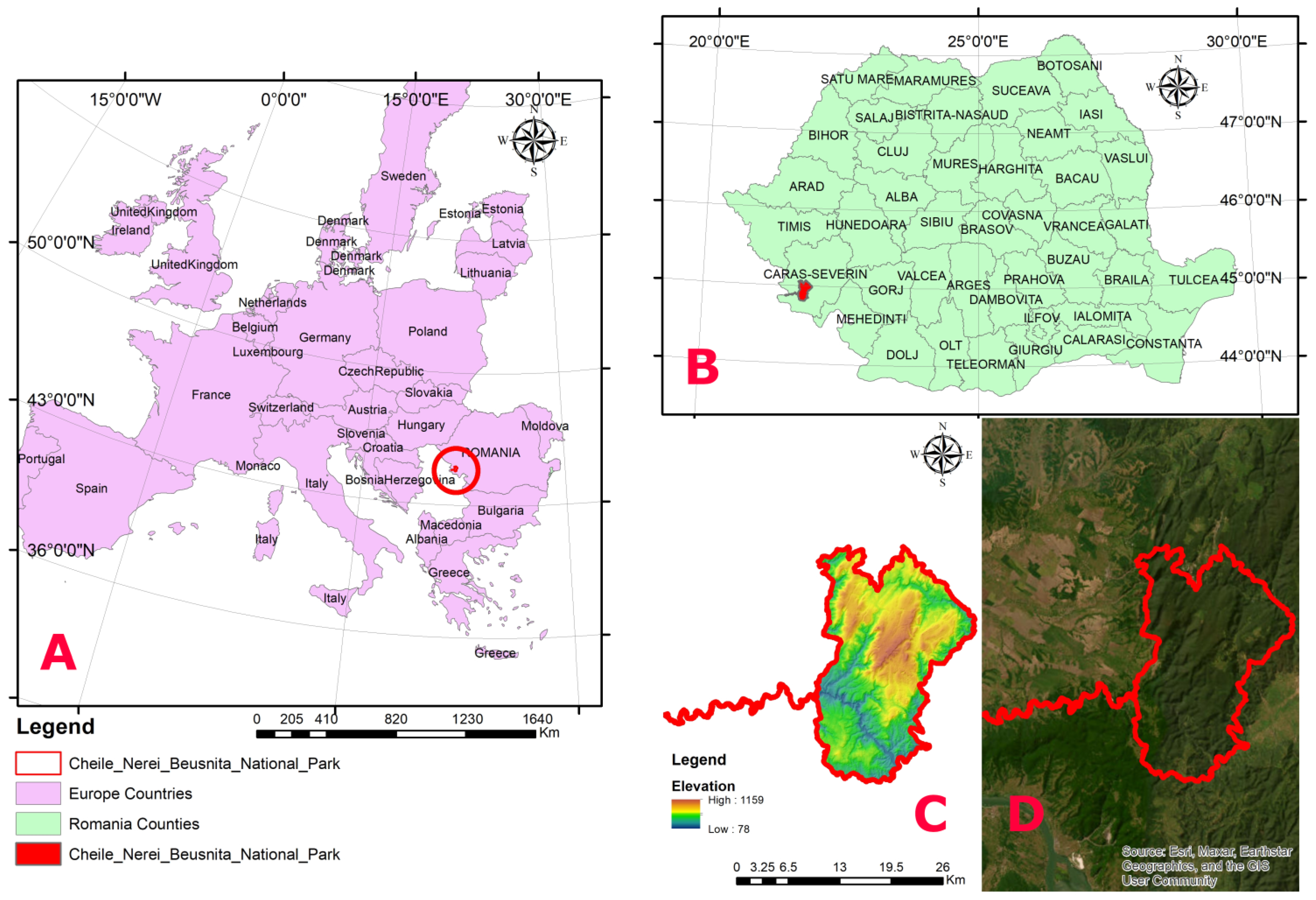 Cheile Nerei–Beușnița National Park (44°56′21″ N, 21°51′24″ E) is located in southwestern Romania, within the Western Carpathians (Figure 1), and covers approximately 37,000 ha (36,660.65 ha), of which 8800 ha are designated as strictly protected reserves. The park was established in 1990 [45], although localised protection measures have been in place since 1943. Altitudes range up to a maximum of 1160 m, with a mean elevation of 600–800 m within the park. The entire park area falls within the continental bioregion. The bioclimatic belts are colline and montane, including the lower montane and middle montane sub-belts.