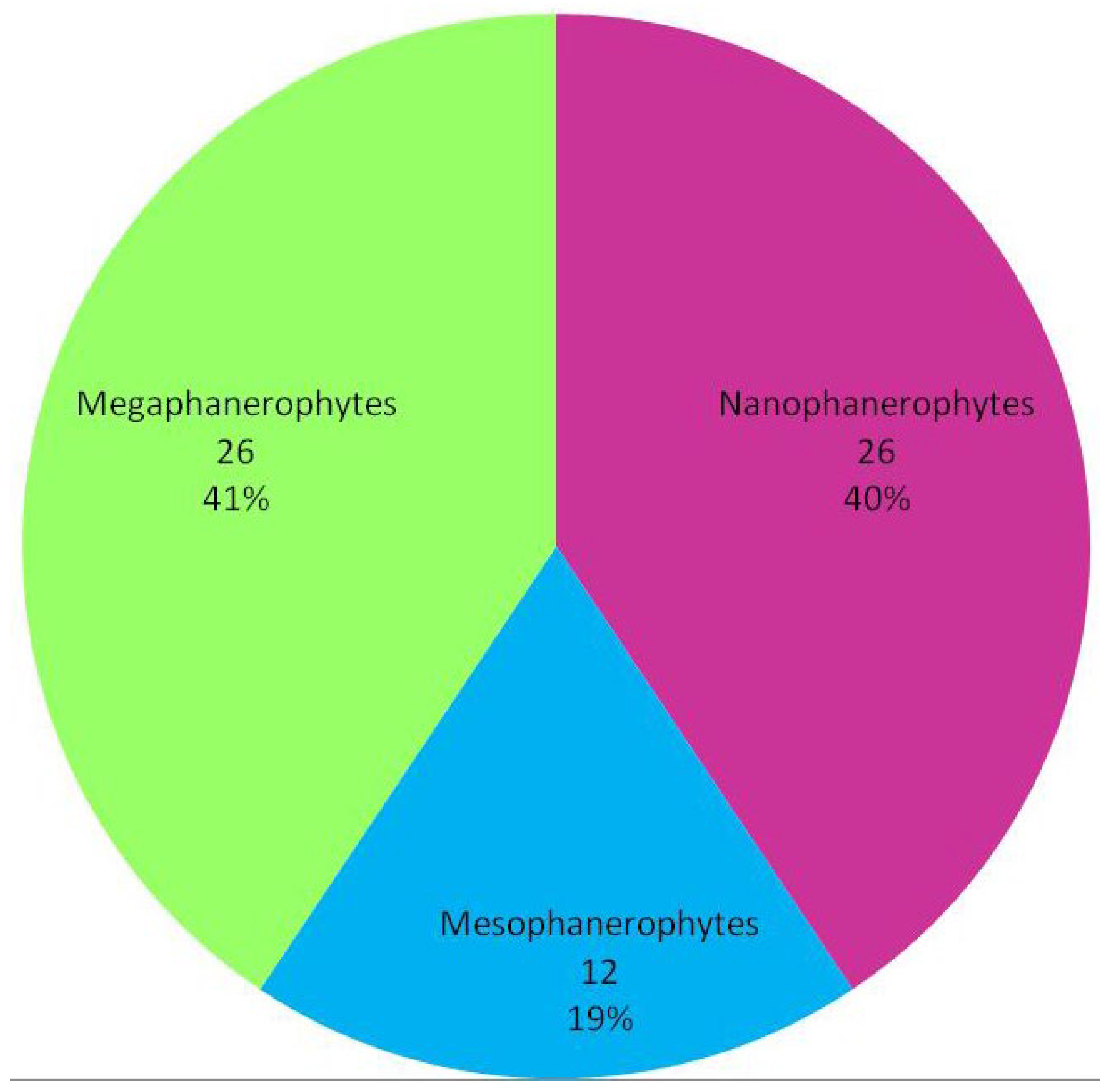 The results of the analysis showed that the woody flora of the studied protected area is dominated by nanophanerophytes (26 species), followed by megaphanerophytes (26 species) and mesophanerophytes (12 species) (Figure 2).
