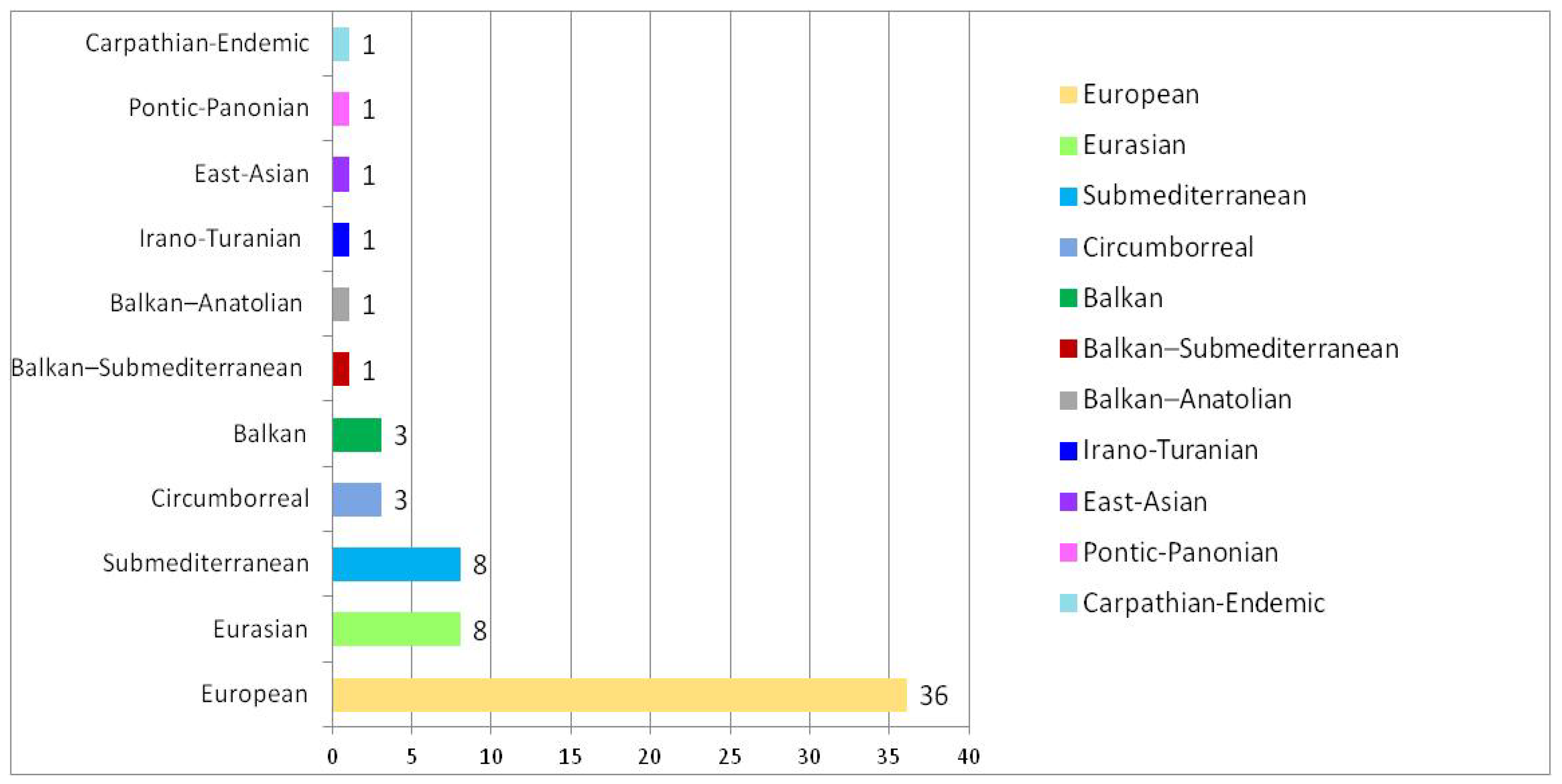 The phytogeographical spectrum of the woody flora in the studied protected park comprises 11 phytogeographical types (Figure 3), with species of European origin being the most numerous. However, the woody flora comprises a mixture of European, Eurasian and sub-Mediterranean dominant elements, suggesting the overlapping of ecological influences elements and the convergence of species adaptation processes over time.