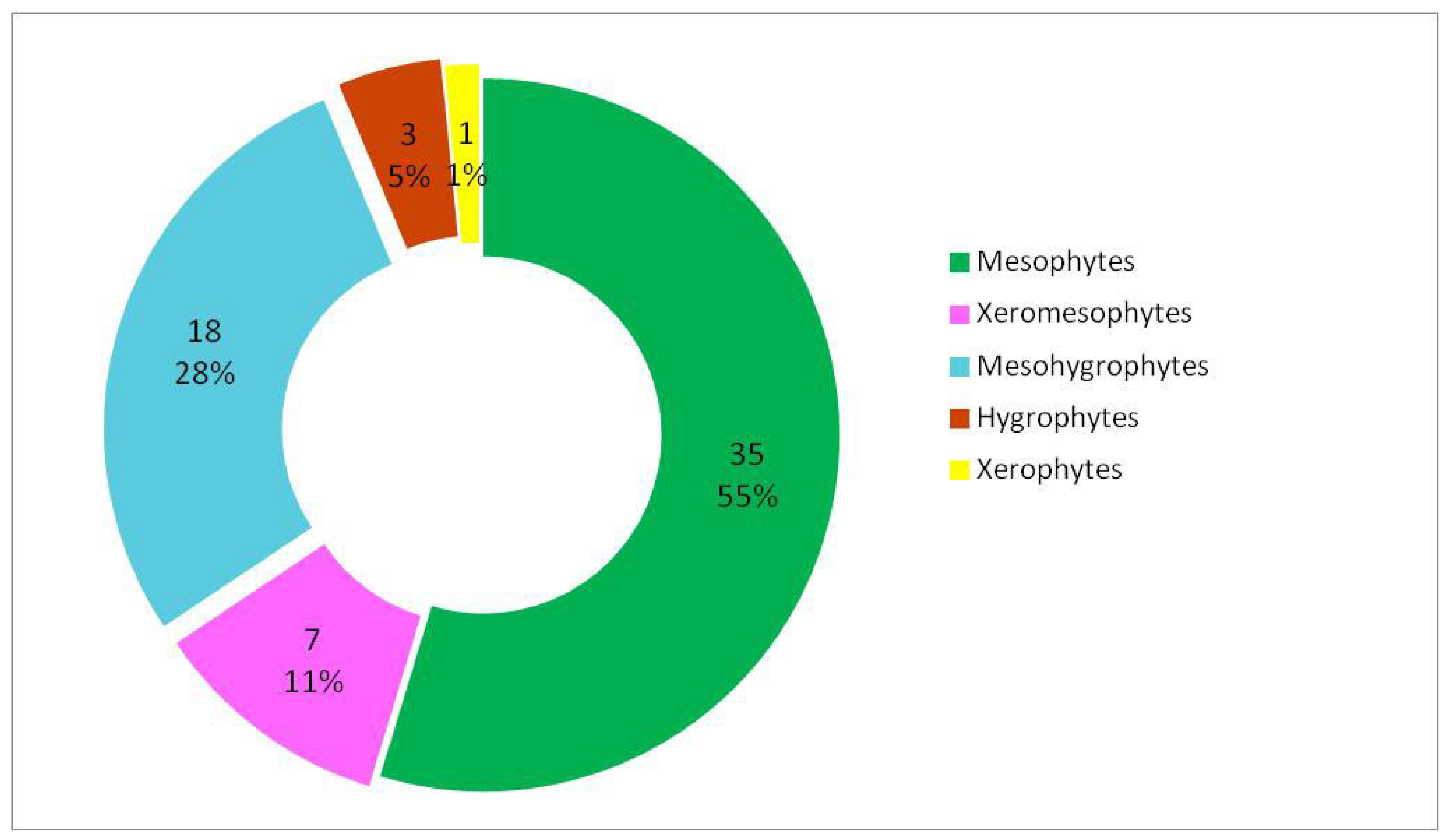 The distribution of woody species according to their moisture requirements (Table 2) indicates a clear predominance of mesophytes, which comprise 35 species (approximately 55%) of the total analysed (Figure 4), which indicate a moderate hydric regime. Among these, 16 are megaphanerophytes, 5 mesophanerophytes, and 14 nanophanerophytes, indicating a balanced participation of trees and shrubs within the mesic segment of the hydric gradient (Figure 5).
