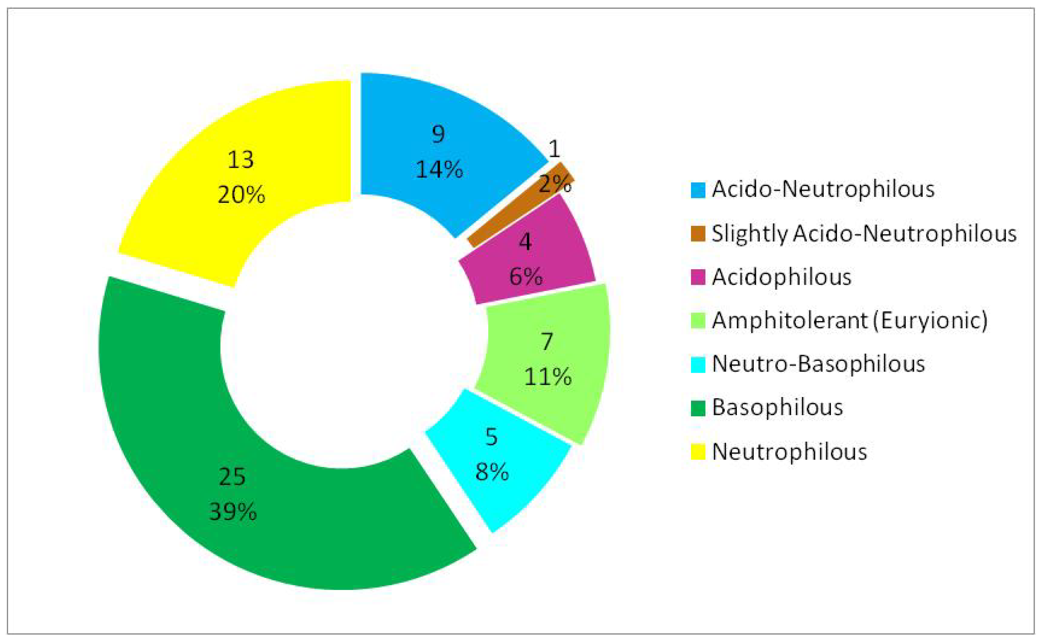 The woody flora present in the studied ecosystem is dominated by basiphilous species (approximately 39%) (Table 2, Figure 8). The neutrophilous segment is also well represented (approximately 20%), indicating a significant influence of the calcareous substrate or of the dominant neutral to basic soils [46] within the ecosystem. Acidophilous species have a low proportion (approximately 6%), indicating a limited presence of acidic substrates (Figure 8).