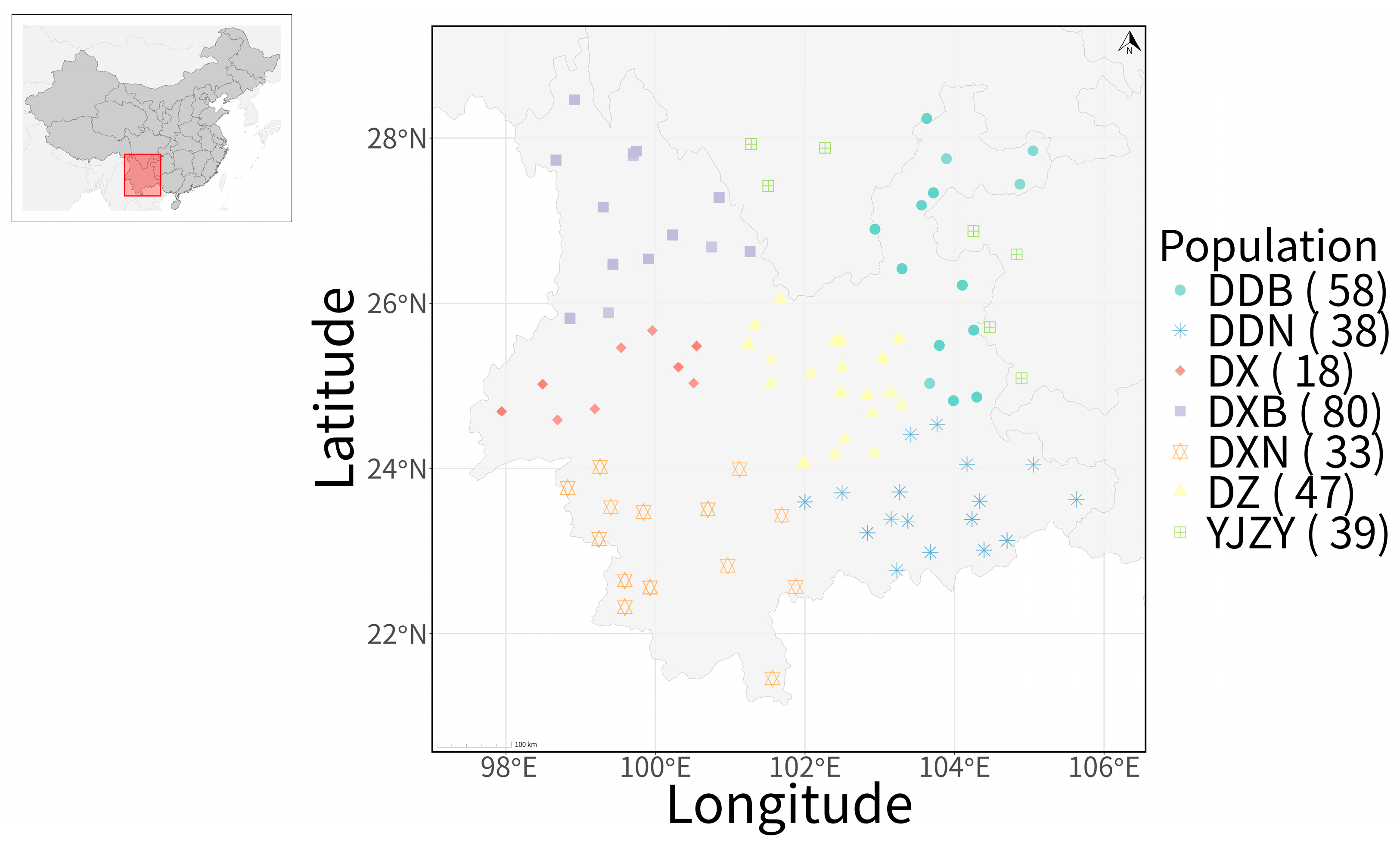 - Chen, C.; Chang, H.; Pang, X.; Liu, Q.; Xue, L.; Yin, C. Genetic diversity analysis and conservation strategy recommendations for ex situ conservation of Cupressus chengiana. BMC Plant Biol. 2025, 25, 552. [Google Scholar] [CrossRef] [PubMed]