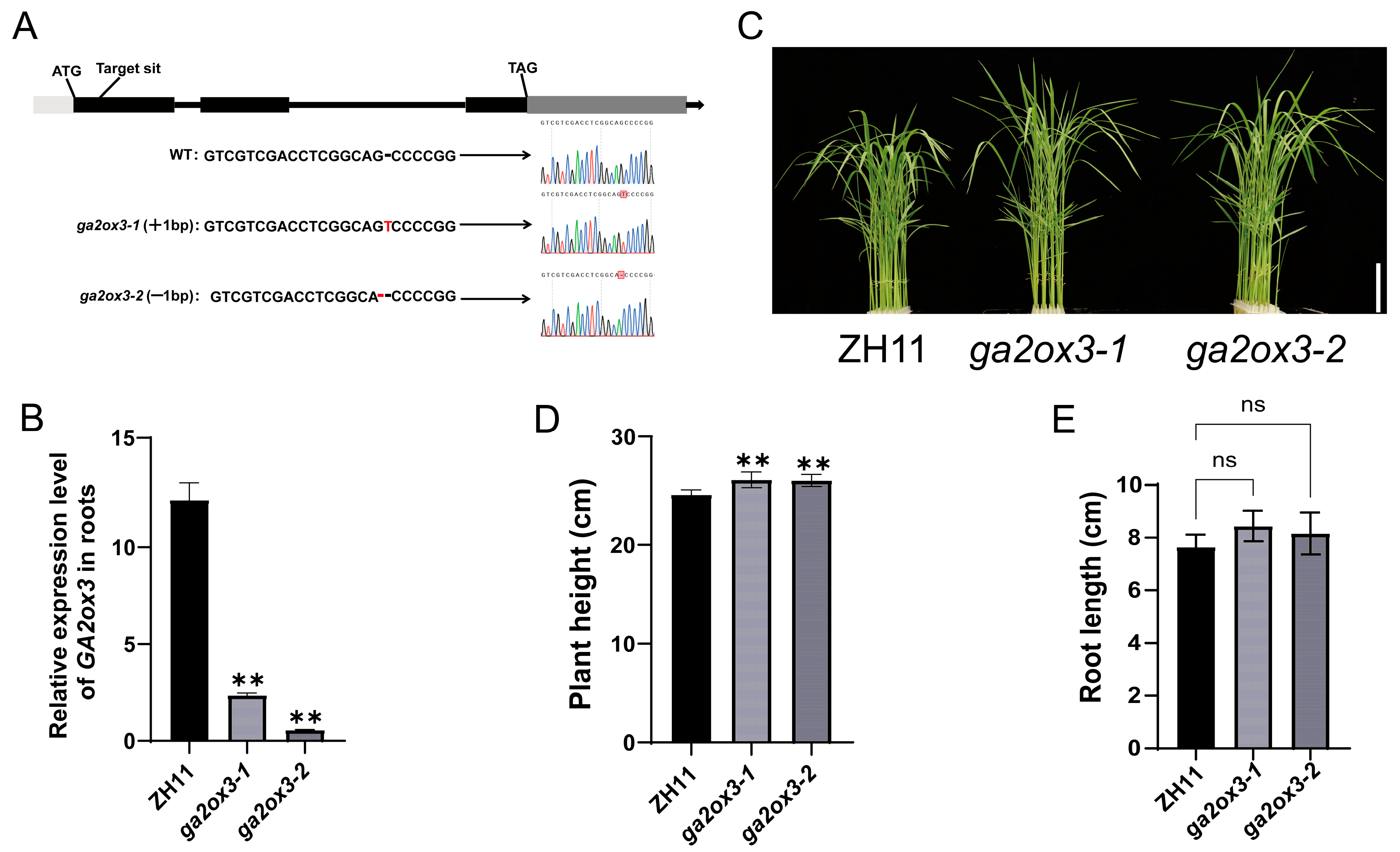 2.1. Loss of GA2ox3 Function Enhances Shoot Growth in Rice Seedlings