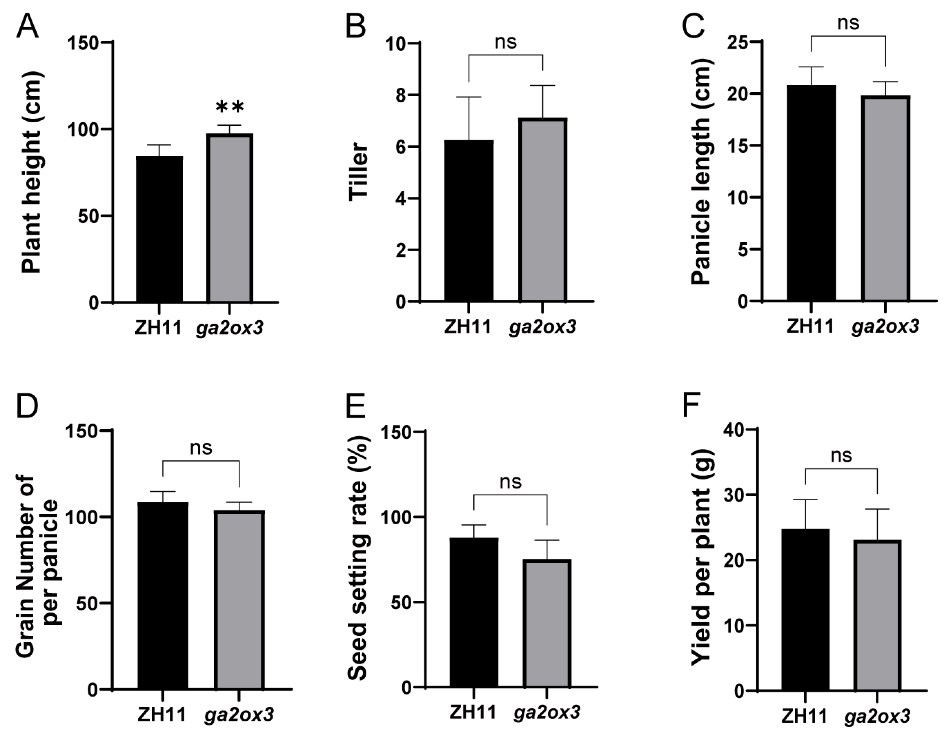 2.2. Disruption of GA2ox3 Increases Plant Height Without Affecting Yield-Related Traits