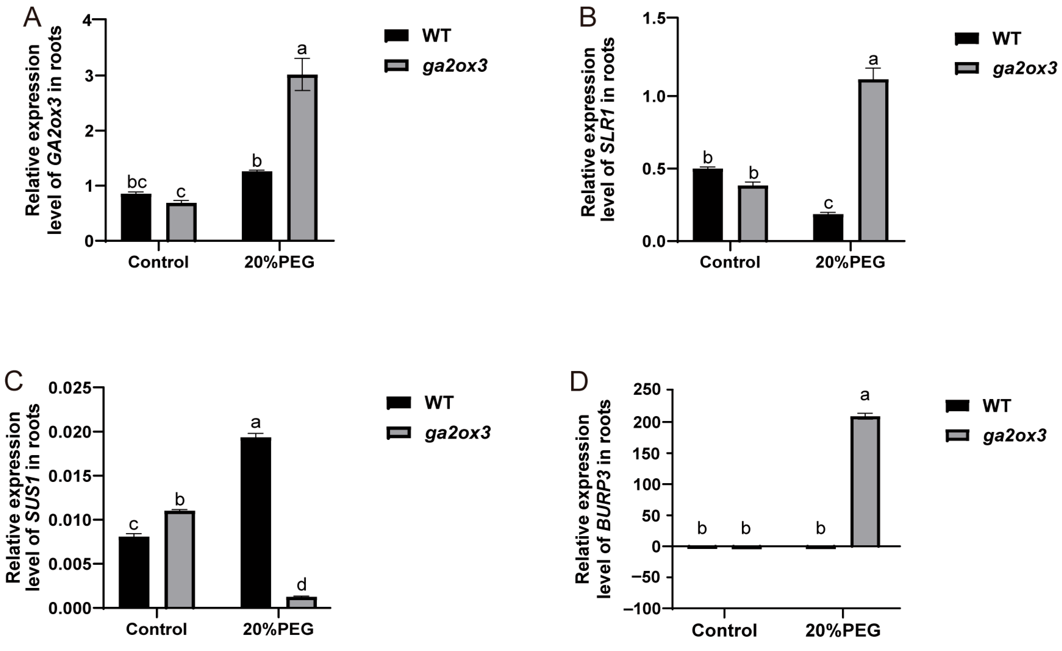 2.5. Altered Expression of SLR1, BURP3, and SUS1 in Response to Osmotic Stress in GA2ox3 Knockout Lines