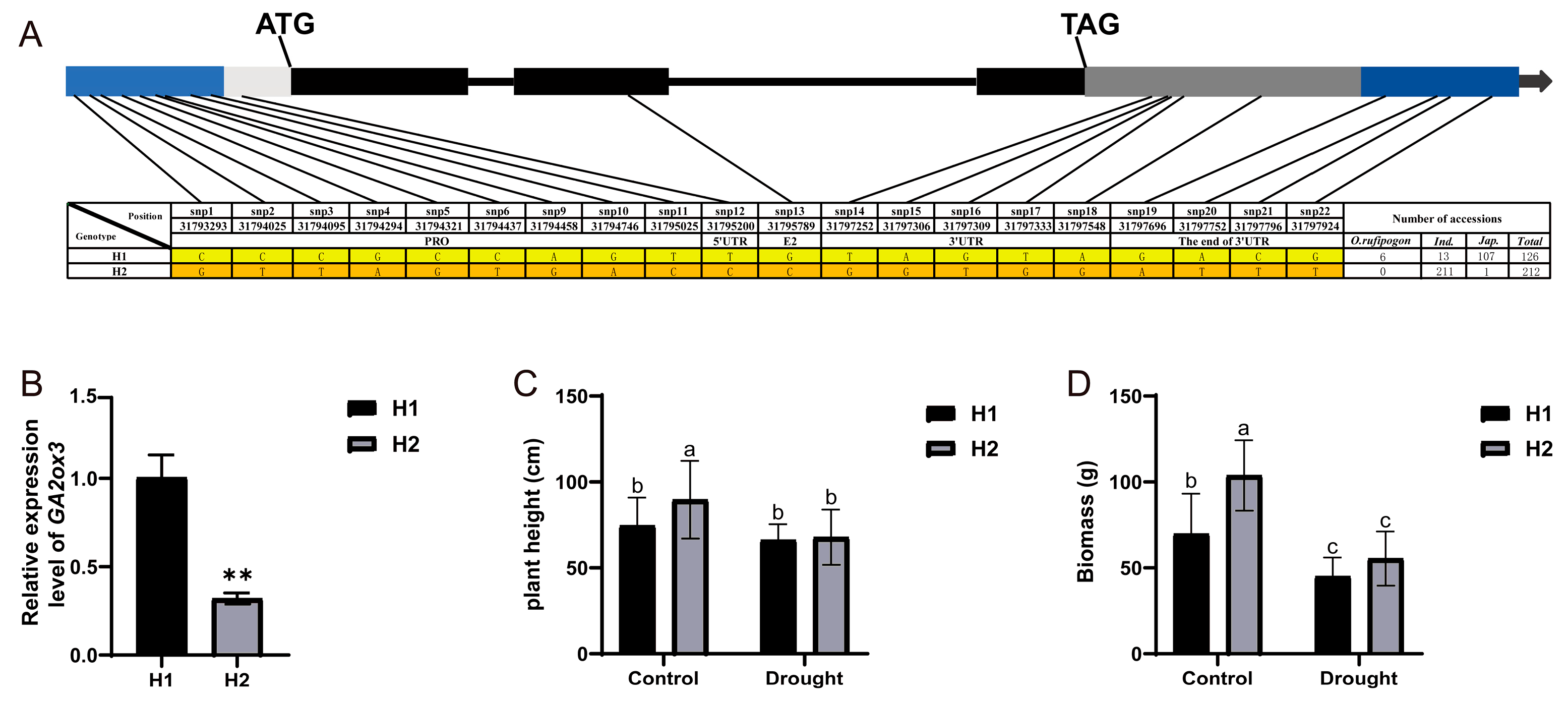 - Wang, Y.; Du, F.; Wang, J.; Li, Y.; Zhang, Y.; Zhao, X.; Zheng, T.; Li, Z.; Xu, J.; Wang, W.; et al. Molecular Dissection of the Gene OsGA2ox8 Conferring Osmotic Stress Tolerance in Rice. Int. J. Mol. Sci. 2021, 22, 9107. [Google Scholar] [CrossRef]