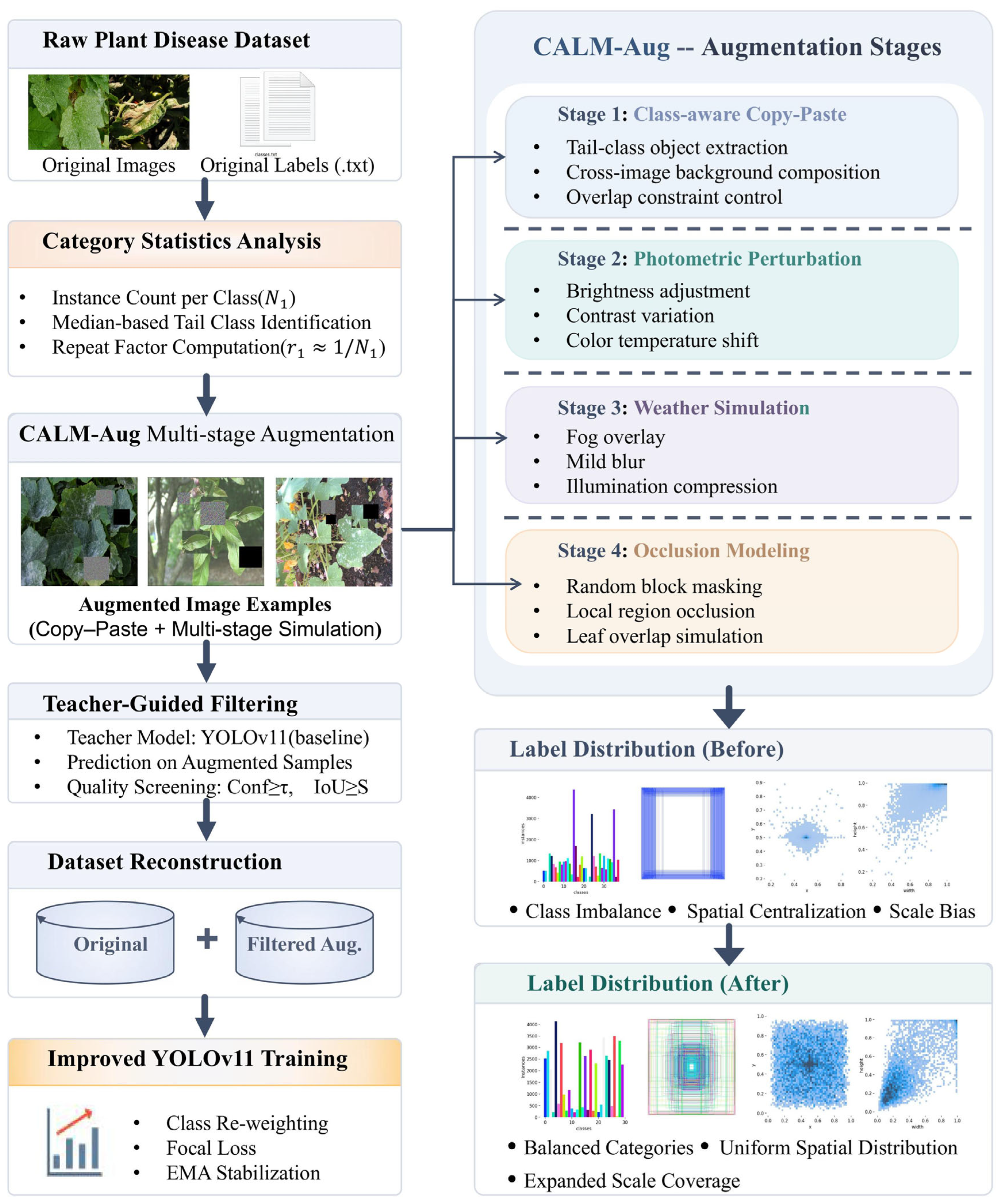 10]. Under this structure, a small number of high-frequency head categories continuously provide a large amount of gradient signals, while tail category samples are diluted by high-frequency signals during the lengthy training cycle; furthermore, due to shooting habits, targets are often overly concentrated in the central regions of images, resulting in extremely weak generalization capabilities of the model for edge regions. Furthermore, since early lesions often manifest as small-scale, low-contrast, subtle textural changes, their effective supervisory signals are easily overwhelmed by higher-level abstract semantics during the learning process of multi-scale networks. Therefore, the design goal of CALM-Aug is not merely to “increase the amount of data”, but to elevate the augmentation process to a form of distribution reconstruction. Its objective is to comprehensively adjust the statistical properties of the training data across three dimensions—category, space, and scale—without introducing uncontrollable noise. This approach guides gradient descent toward minimizing training risk in a manner that better matches the risk reduction required in real agricultural scenarios.
