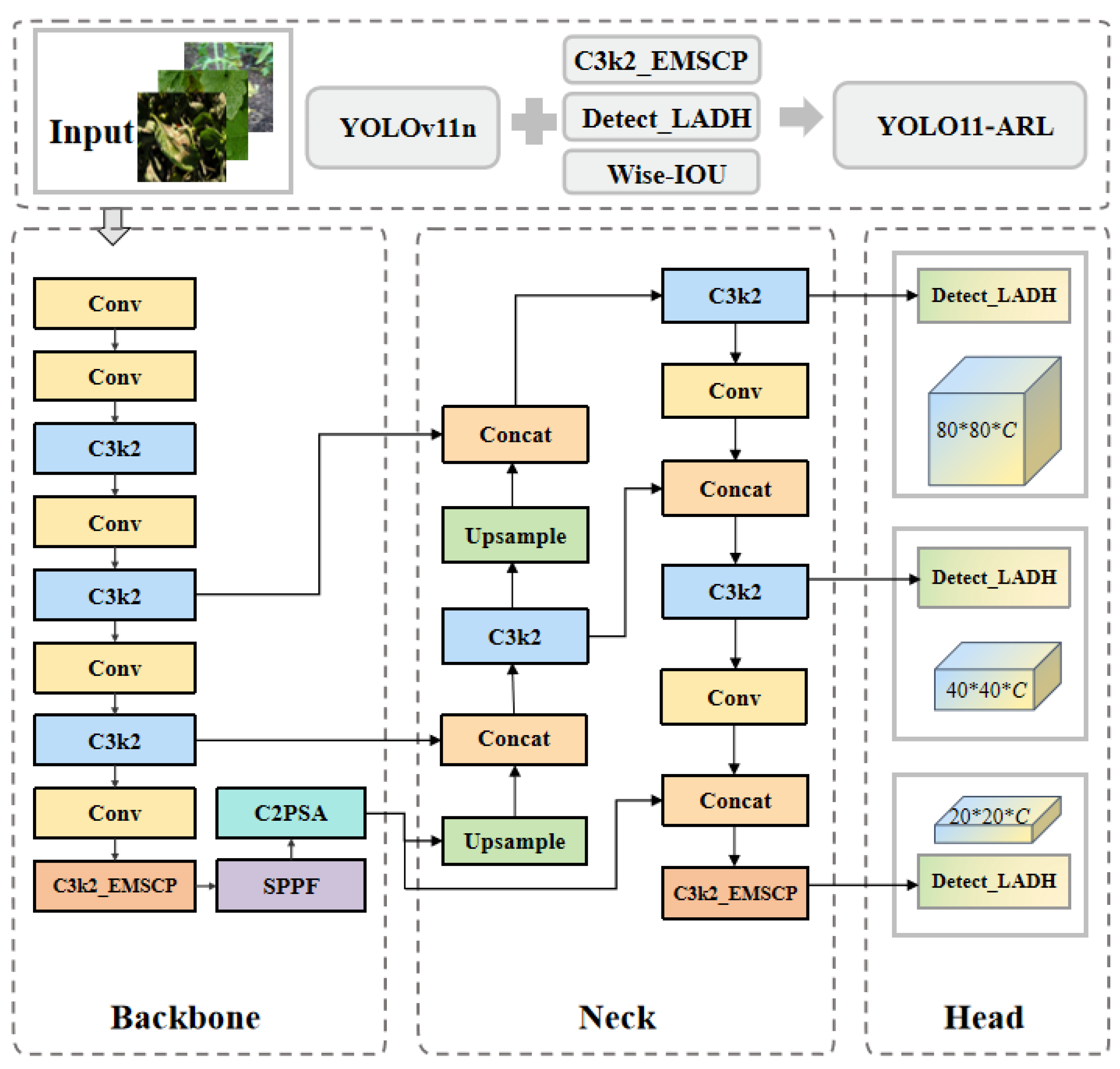 13]. To address these challenges, we adopted YOLO11n as the base architecture. While maintaining the original backbone topology, we locally restructured the critical paths to tackle the aforementioned difficulties in plant disease detection, thereby constructing the YOLO11-ARL model.