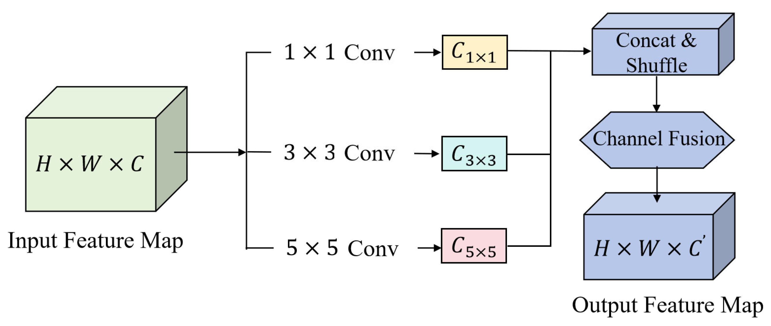 21]. For small-scale, low-contrast lesion targets, multi-scale local modeling can preserve essential details in high-level semantic spaces. Compared to simply increasing network depth, this architecture focuses on modifying the organization of scales to optimize feature discrimination.