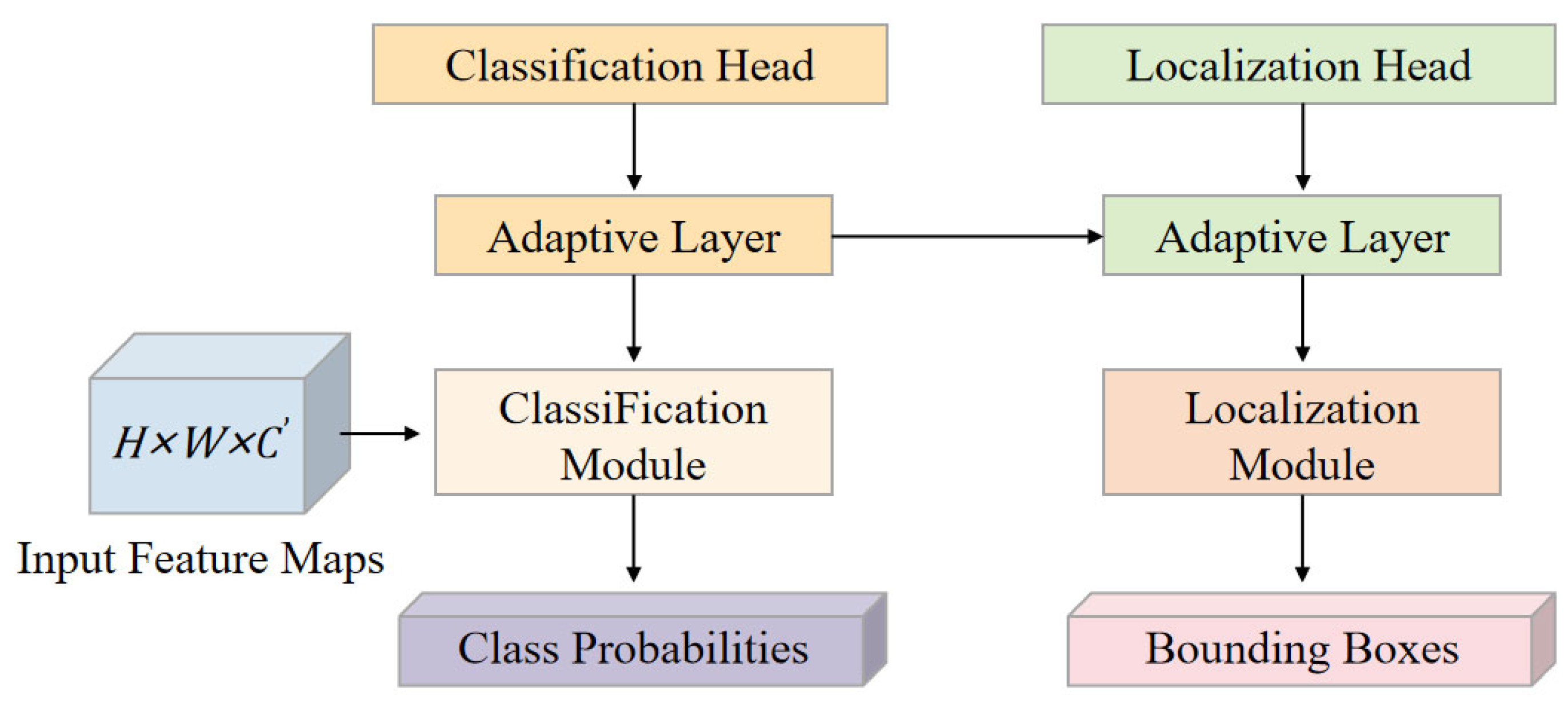 23]; however, these approaches often result in an increase in the number of parameters and introduce new uncertainties in optimization. LADH utilizes structural decoupling to separate the classification and regression paths, reducing the number of shared parameters. Its structure is shown in