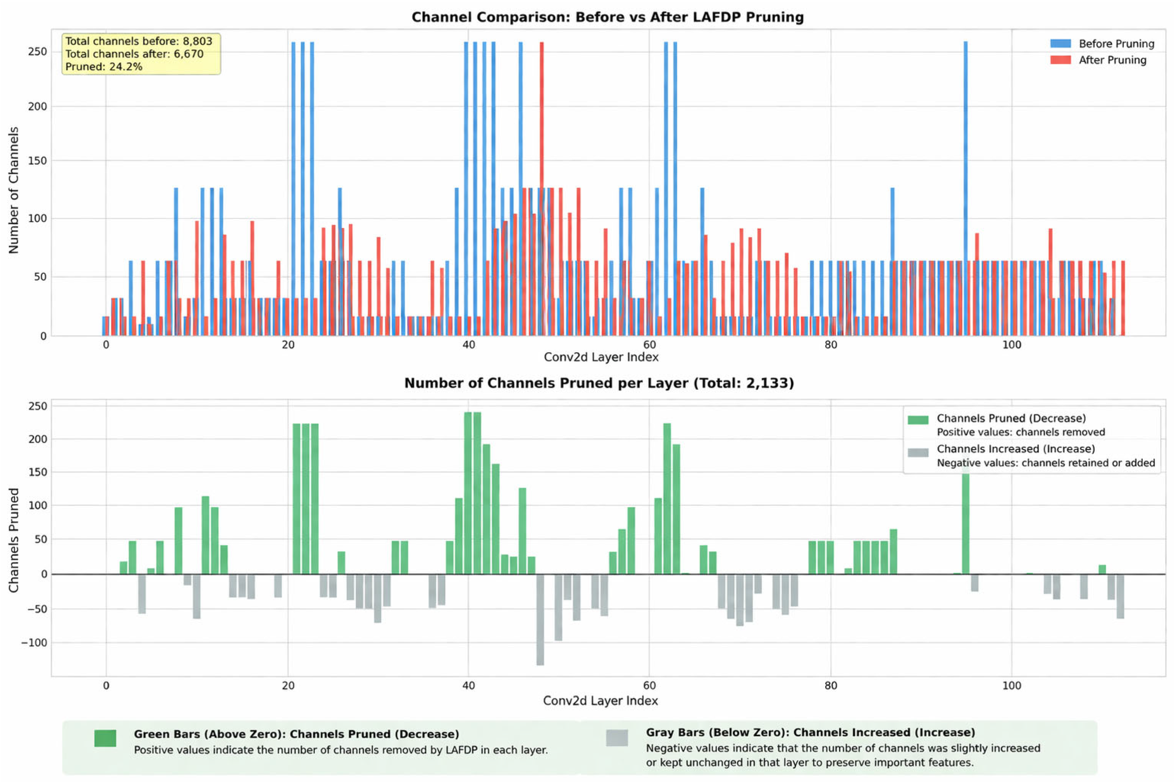 Furthermore, in some layers shown in the figure, channel changes are not entirely monotonic, and even local negative values may appear. This does not imply instability in the compression process or statistical errors, but is primarily related to channel reorganization performed during pruning to maintain network structural connectivity and feature transmission continuity. LAFDP does not perform mechanical pruning on the network but simultaneously considers structural feasibility, path integrity, and feature expression continuity during the compression process. For this reason, although certain layers participate in the compression process overall, their local structures may exhibit non-monotonic changes due to path matching or module reconstruction.
