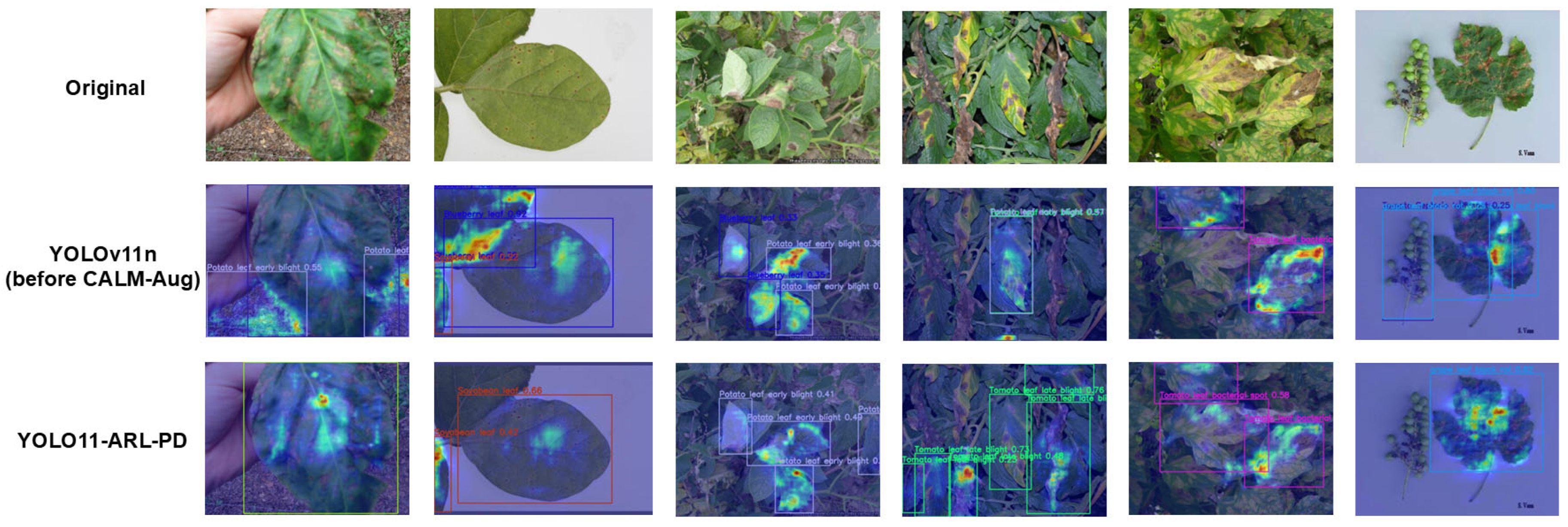 Benchmarking results show that YOLO11-ARL-PD achieves 89.0% precision and 71.2% mAP@0.5–0.95, outperforming many mainstream lightweight detection models. Cross-crop testing demonstrates that the improved model consistently performs better on public datasets for tomato, corn, and apple. Visual results indicate that the model exhibits more focused responses and better boundary alignment in scenarios involving isolated objects, objects with visible edges, densely clustered objects, and occluded objects.