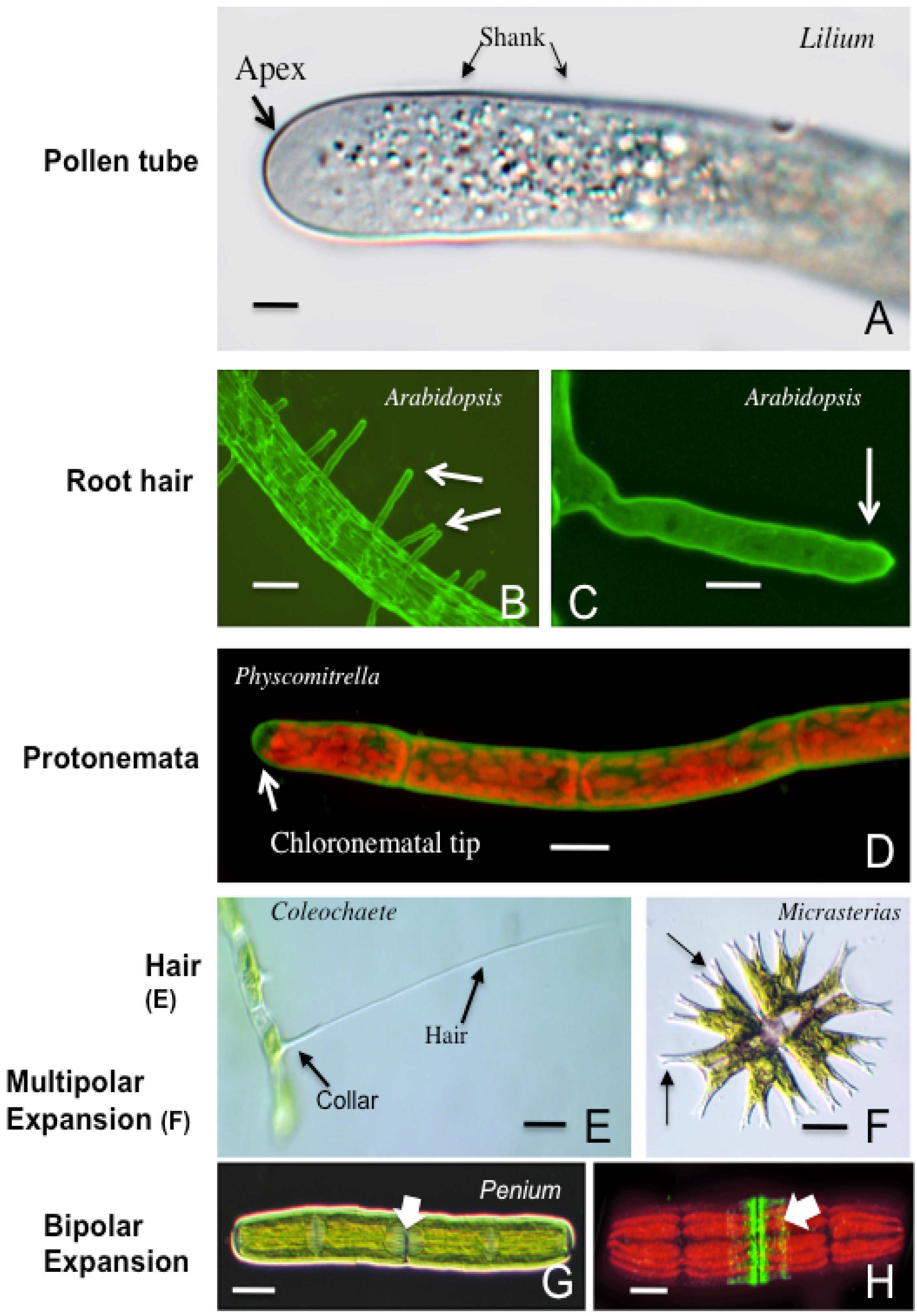 The diverse range of polar expansion mechanics in plants. (A) highlights the vesicle-rich zone at the apex of a Lilium pollen tube. The shank constitutes most of the pollen tube. Differential Interference Contrast (DIC) microscopy image. Bar = 6 µm; (B) shows the emergence of root hairs (arrows) from the root of Arabidopsis labeled with the anti-xyloglucan antibody, LM15. Confocal Laser Scanning Microscope image (CLSM). Bar = 100 µm; (C) is a magnified view of the root hair labeled with LM15. CLSM image. Bar = 20 µm; (D) displays the chloronemata stage of the gametophyte phase of the life cycle of Physcomitrella labeled with the anti-HG antibody, JIM5. CLSM image. Bar = 10 µm; (E) is a hair cell or seta of Coleochaete nitellarum. Note the elongate hair as it emerges from the basal collar. DIC image. Bar = 25 µm; (F) displays the multi-lobed nature (arrows) of the desmid, Micrasterias. These lobes are products of multi-polar expansion. DIC image. Bar = 10 µm; (G) shows the two semicells surrounding a central isthmus (arrow), the site of pre-division expansion in Penium. DIC image. Bar = 8 µm; (H) is a JIM7-labeled (sp. = high esterified HG) Penium in a pre-division expansion. Note the two bands at the isthmus (arrow), the site of the bipolar growth mechanism. CLSM image. Bar = 5 µm.