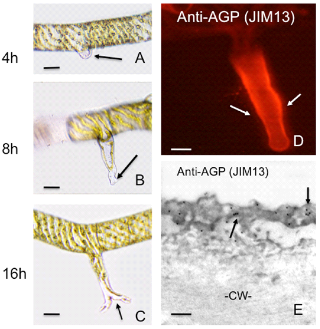 Wound-induced rhizoid formation in Spirogyra. (A) shows the emergence of a rhizoid (arrow) from the cell adjacent to a cell artificially wounded (i.e., cut) 4 h earlier. DIC image. Bar = 20 µm; (B) displays the rhizoid 8 h after wounding. Note that branching occurs at the tip (arrow). DIC image. Bar = 20 µm; (C) shows the rhizoid after 16h and the extensive branching that has taken place. DIC image. Bar = 20 µm; (D) shows a rhizoid labeled with the anti-AGP antibody, JIM13. Note that only the rhizoid wall labels (arrow). CLSM image. Bar = 15 µm; (E) is a JIM13 immunogold labeling of the rhizoid wall, Note that a sheath (arrows) external to the main cell wall (CW). Transmission electron microscopy (TEM) image. Bar = 100 nm.