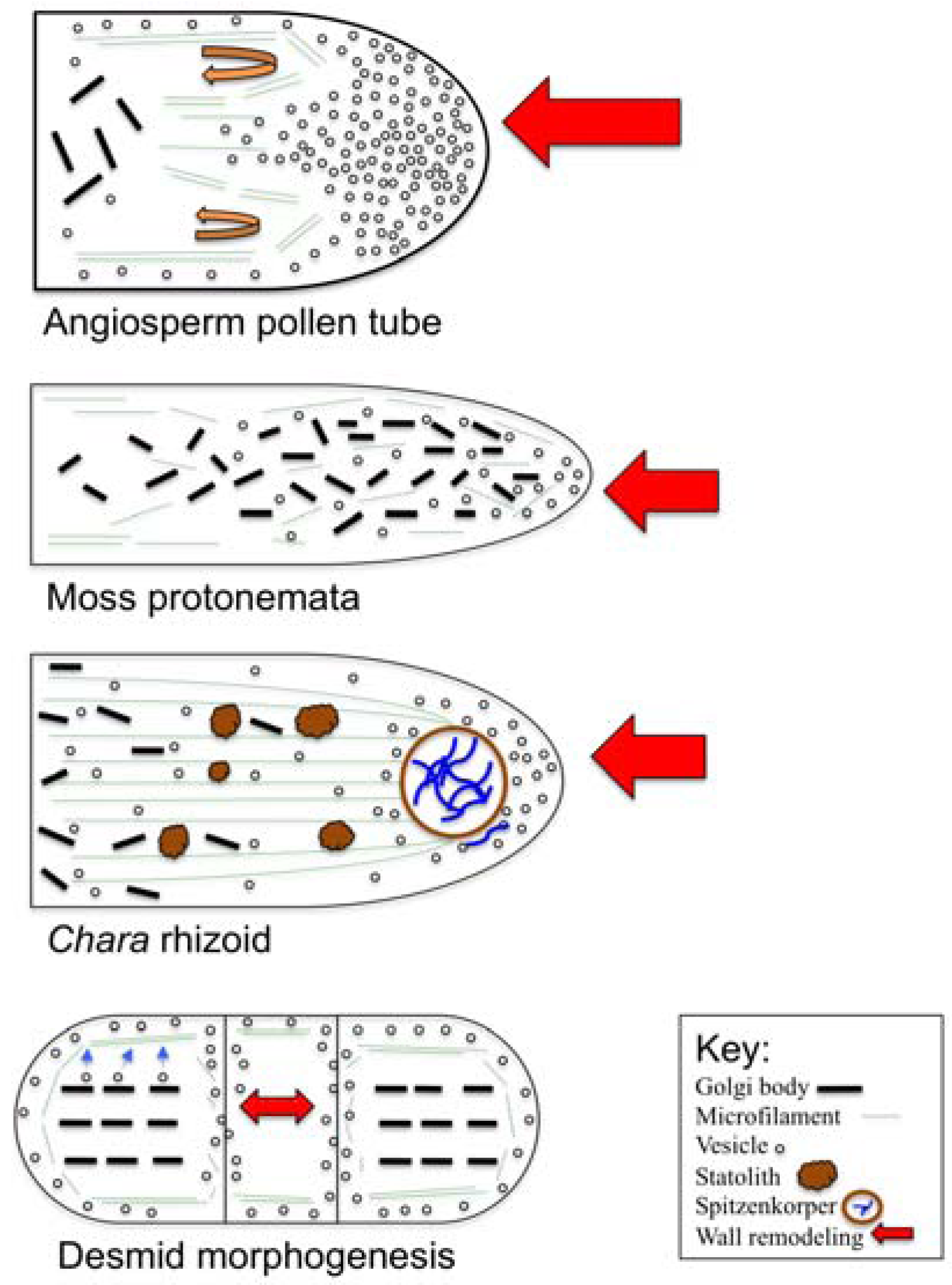 Figure 3 summarizes key examples of the polar wall and cell expansion mechanisms in plants. In angiosperm pollen tubes [132,133,134,135,136,137], Golgi-derived, wall precursor-containing vesicles travel to the tube tip along actin microfilaments in a reverse fountain-type mechanism (curled arrows). In the subapical zone of the tip, the wall precursors are released (i.e., the site of wall remodeling). The Golgi bodies are positioned in a more distal region beyond the polar tip. In moss protonemata (e.g., caulonemata) [117,118,119,120,121,122], organelle zonation occurs but is more subtle with a larger proportion of Golgi bodies found near the tip. Actin microfilaments also transport vesicles to and within the tip zone. In Chara rhizoids [108,109,110,111,112,113,114,115], the growing tip contains an ER-vesicle aggregate known as the Spitzenkorper that serves as a site of actin organization and membrane trafficking. Also in the tip, statoliths, most likely made of barium sulfate, that are employed in gravitropism are held in place by the microfilaments. Vesicles are delivered to the tip from distal regions of the terminal rhizoid cell cytoplasm via the actin microfilament network. In desmids [87,88,91,92,93,94,95,96,97,98,99,100], polar expansion often occurs on multiple fronts. Large numbers of Golgi bodies are arranged in a symmetrical pattern in the cytoplasm and produce wall precursor-containing vesicles. The vesicles travel to the peripheral cytoplasm where they are transported around the cell in an actin microfilament-driven cytoplasmic streaming network. During polar expansion, the wall precursor-containing vesicles move to sites of polar expansion during pre- or post-cell division expansion.
