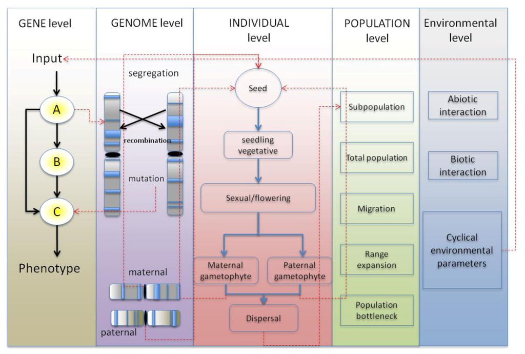 There is an increasing awareness of how our climate is changing due to continuing urbanization and industrialization of our planet, and of the possible conservational, ecological and sociological implications. With research studies demonstrating that climate change can affect crops on a genotypic [] and a phenotypic level [], it is desirable to improve our understanding for plant adaptation so that it may be exploited to produce crops more resilient to shifting climates, pests and disease, which in turn can be grown to produce larger yields. A related field is the study of genotype-by-environment (GxE) interaction. GxE interactions are widely studied within epidemiological studies [,,], and are of particular relevance to agronomy. These studies are concerned with finding significant correlations between crop genotypes and non-genetic factors, such as climate or environments, in the interests of increasing crop yield [,,,,]. In order for such GxE interaction studies to be performed, a comprehensive knowledge of genotypes and of polymorphic non-neutral loci is required. Single-nucleotide polymorphism (SNP) data extracted from using amplified fragment length polymorphisms (AFLPs) are useful markers for demonstrating such genetic differentiation and AFLPs combined with whole genome-scans [] have previously demonstrated adaptation at different environments such as temperature mediated selection in trees []. Mega-bases of sequence data belonging to non-model organisms may now be obtained from next-generation sequencing (NGS) technologies [] with such studies having been used to demonstrate population differentiation [,] and adaptation of individuals to different environments [,]. As the environments that organisms reside in are highly dynamic due to regular events such as seasons, night and day cycles, or due to unexpected events such as droughts or floods, it is desirable to quantify the differential gene expression of the alleles of interest. Experimental techniques for accurately identifying protein-DNA interactions such as chromatin-immunoprecipitation coupled with microarrays (ChIP-chip) [,] or in more recent years the use of RNA-Seq [] combined with ChIP-Seq [] has allowed differential expression patterns at different conditions and the inference of gene-regulatory networks (GRNs) to be determined. Complete GRNs when used in a predictive capacity will provide a useful tool for agronomists to improve crops [,]. In recent years, there has also been an interest in merging together the different disciplines in order to assess the differential gene expression data in segregating populations, in the form of eQTL’s []. However, despite the numerous mathematical modeling studies that have developed GRNs from expression data, and the numerous programs and tools developed for population and landscape genetics used to model the evolution of individuals with neutral and adaptive loci, to our knowledge no studies have been made to combine the two disciplines and develop models that contain simulated individuals with GRNs that can adapt through a landscape. Such models would be capable of simulating a system that contains the hierarchical levels of regulation that are intricately involved in the adaptation of organisms to their environment. These levels include the gene, genome, individual, population and environment, Figure 1. In such models, a gene may interact with other genes and up-regulate or down-regulate its downstream target genes, eventually inducing a phenotype. The genome accumulates mutations and recombines its comprising homologous chromosomes to produce new genotypic variants, some of which may be adaptive or deleterious. The individual undergoes different life histories, generates gametes, reproduces, and either synergistically or antagonistically interacts with other individuals. The (sub)population collectively adapts to its local environment and may undergo range expansions and admixture with other populations within the meta-population, sometimes outcompeting these populations or forming hybrid zones when speciation events have occurred. Finally, the environment contains dynamic abiotic and biotic factors that may interact with the individuals. Abiotic factors include light or temperature that can change cyclically or unexpectedly, directly impacting on the needs of the individuals (such as facilitating or inhibiting their dispersal for instance), whereas biotic factors from other organisms interact with the individuals of interest. Plants are interesting organisms to model due to their sedentary nature. For example, their dispersal is more limited and often reliant upon environmental features in the case of anemophily and anemochory (wind dispersal of pollen and seeds), hydrophily and hydrochory (water dispersal) or is reliant upon other organisms in the case of entomophily and zoochory, or through cultivation by humans. Unlike animals, they are unable to migrate away from their environments and often exhibit phenotypic plasticity as a result. Furthermore, many plants are allopolyploids and autopolyploids with the potential for providing more of an insight into the underlying genetics, although at a greater complexity. In this review, we discuss previous population and landscape genetics simulation models, including simulations from our laboratory and current methodologies to simulation GRNs. We then move onto examples where population genetics models making use of GRNs will be beneficial within evolutionary biology.