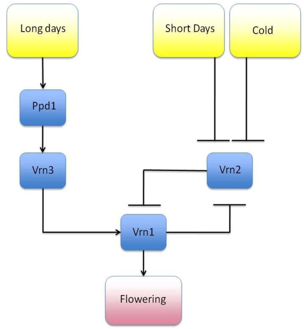 Vernalization and photoperiodicity in Barley. Gene Vrn2 negatively down-regulates gene Vrn1, preventing flowering. During periods of cold, short days, Vrn2 is down-regulated. However a period of long days is required to activate genes Ppd1 and Vrn2, which activate flowering.